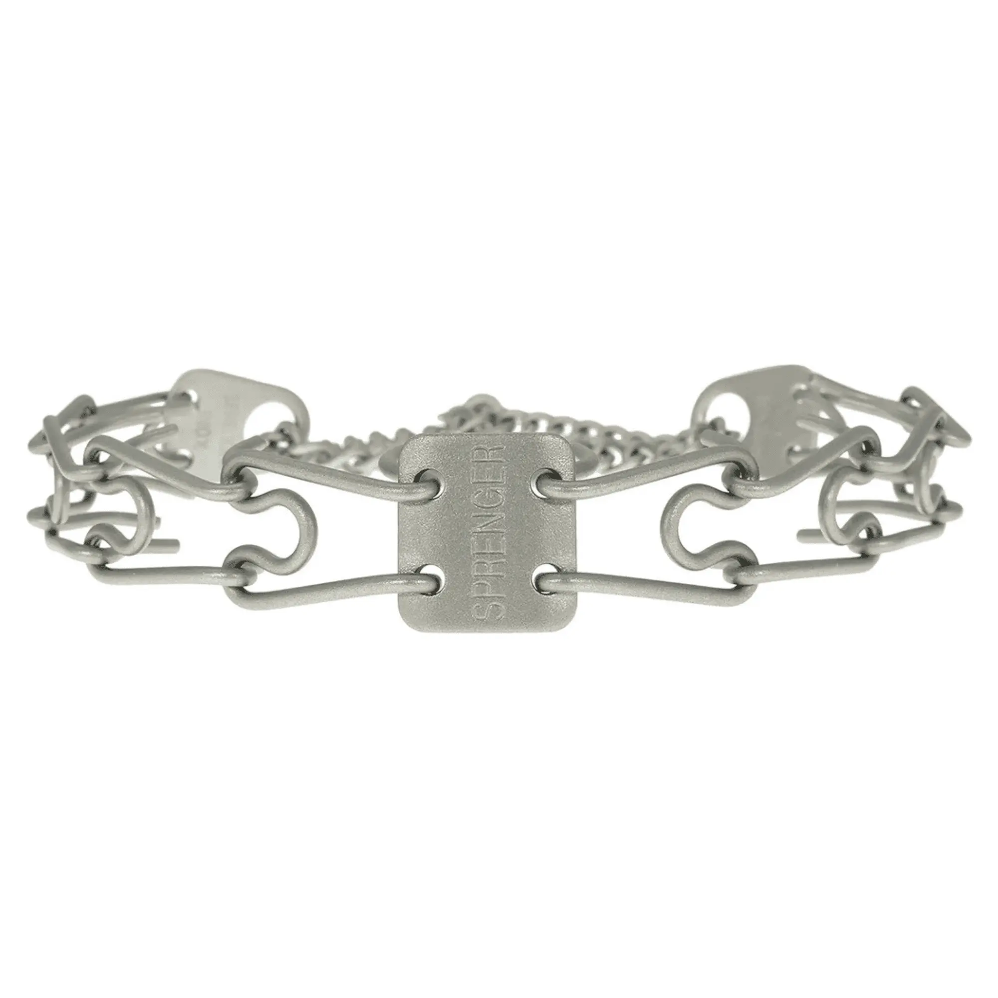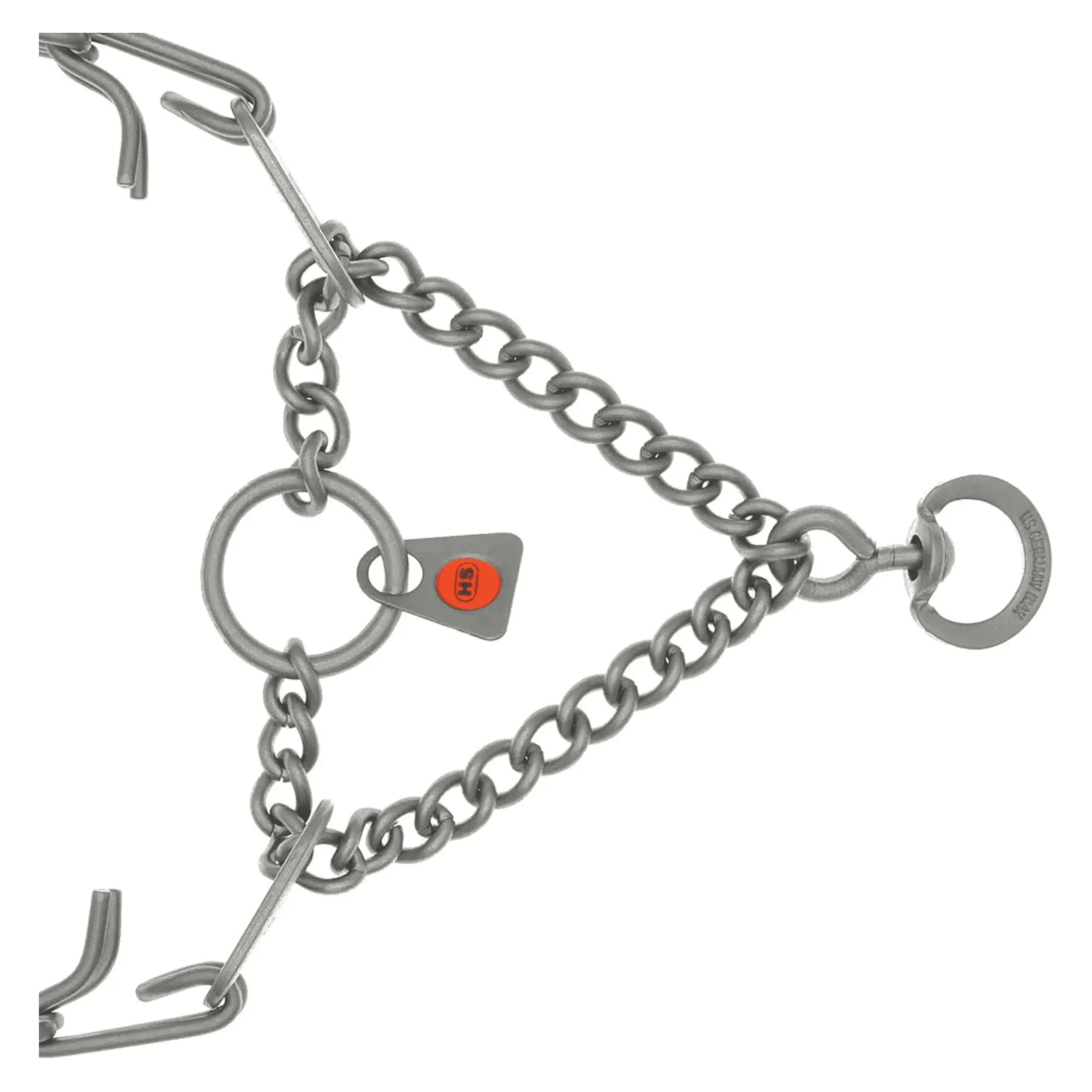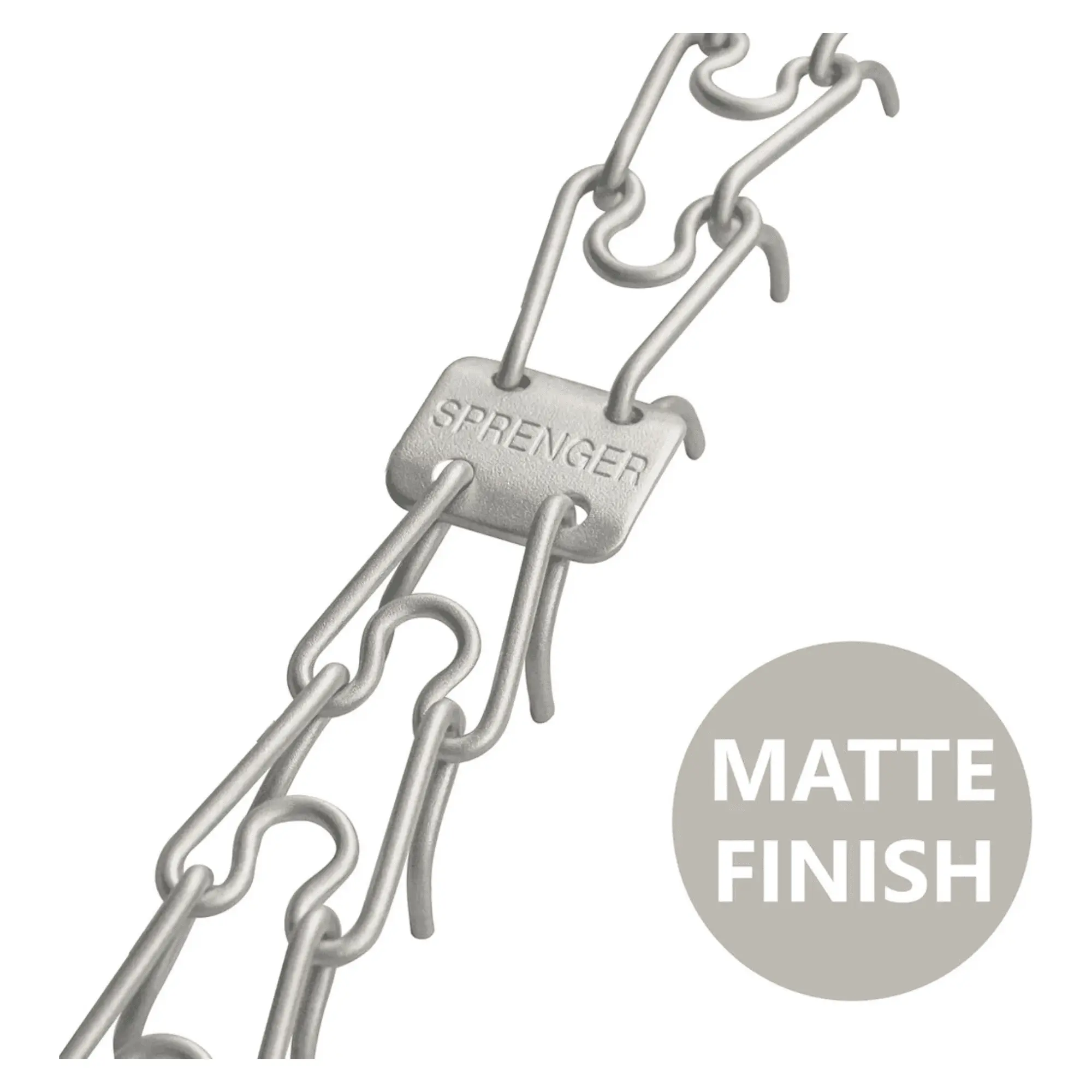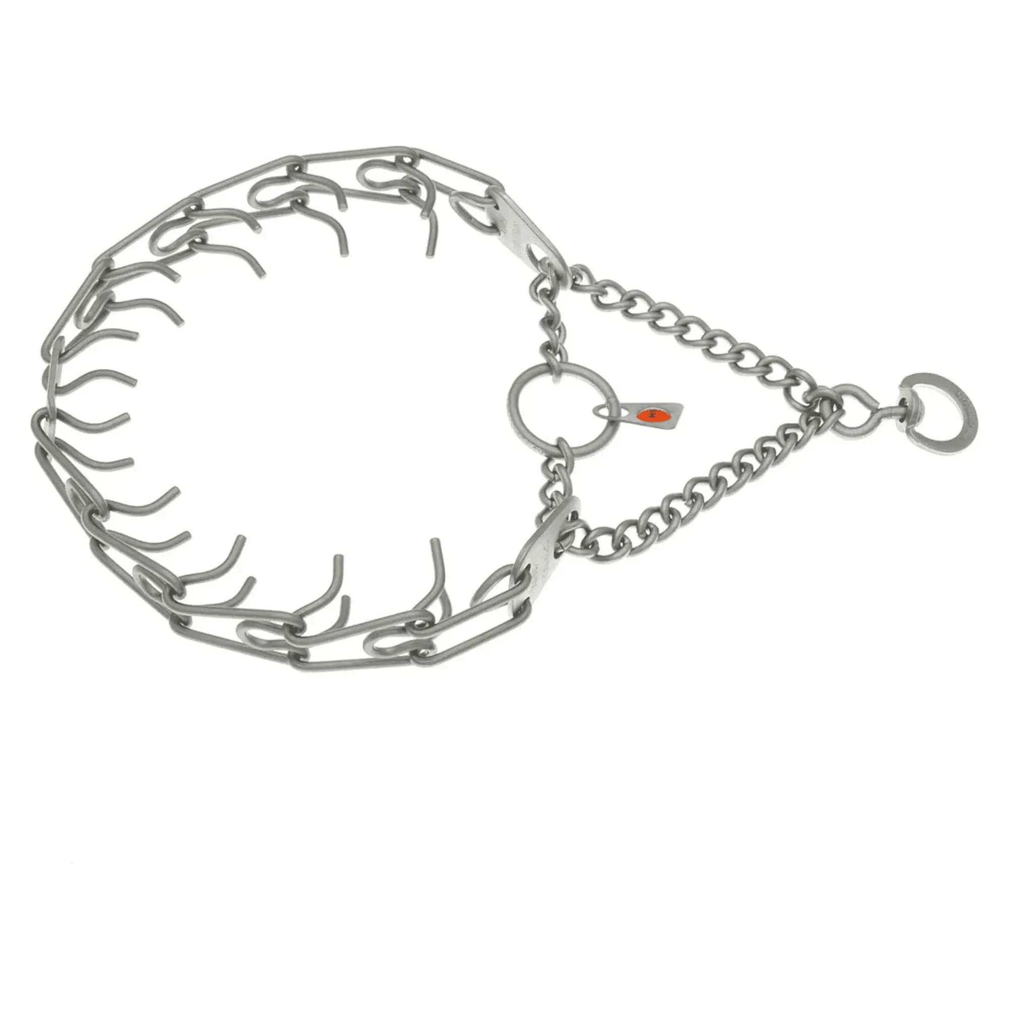 Built from rust-resistant and scratch-resistant matte stainless steel, this collar offers a modern, durable alternative to traditional polished or chrome-plated collars. The martingale-style design with center plate ensures balanced correction, making it a trusted tool for both professional trainers and dog owners.