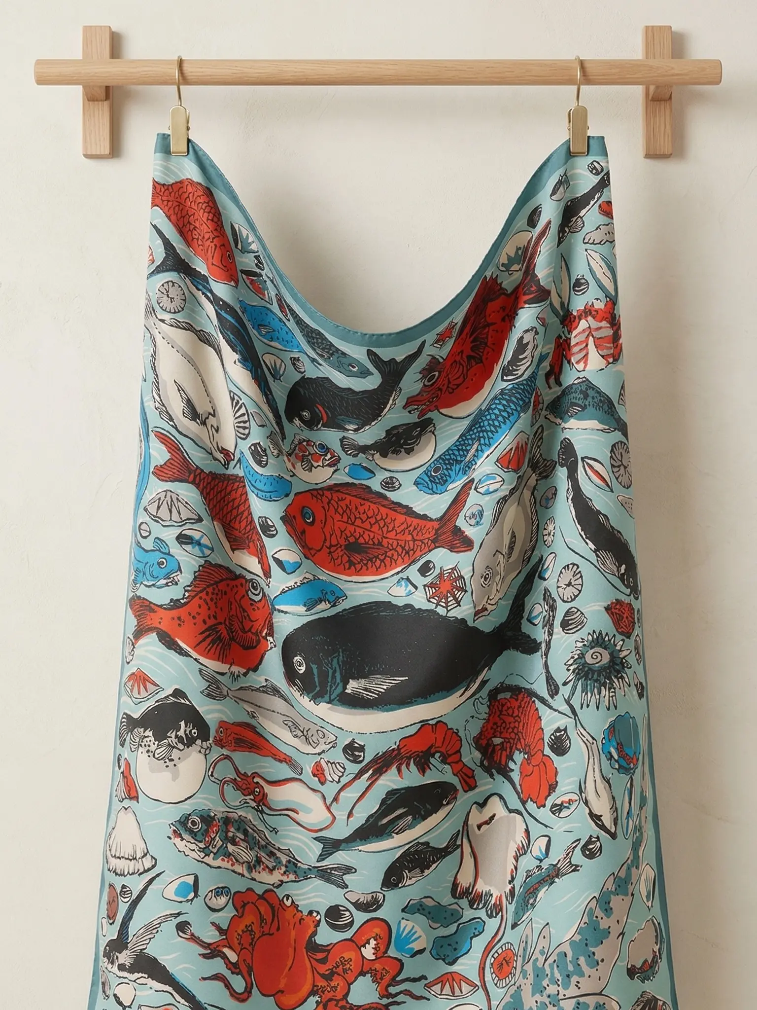 This bandana features a playful, hand-drawn design inspired by a classic Mediterranean picnic — think sardines, fresh lemon slices, and olives, all framed by a timeless striped border. The vibrant blue ink pops perfectly against the natural cotton background, creating a fresh yet vintage aesthetic that’s easy to style year-round.