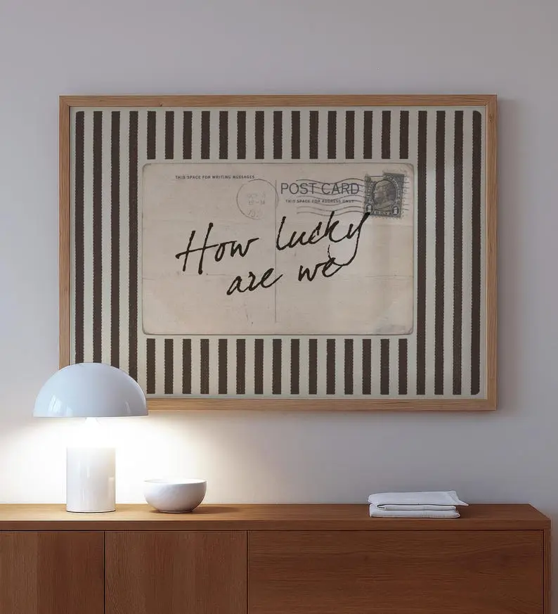 5. [Sale up to 50%] [Free Ship] How Lucky Are We Wall Art – Vintage Postcard Quote Print, Coquette Brown Striped Aesthetic Poster, Old Money Sentimental