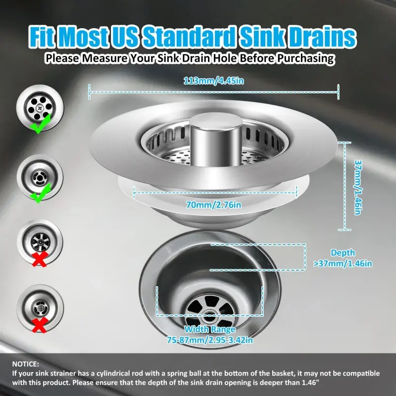 【Efficient Straining】: Designed with anti-clogging capabilities, this 3 in 1 kitchen sink drain strainer ensures debris is easily caught while allowing water to flow freely.