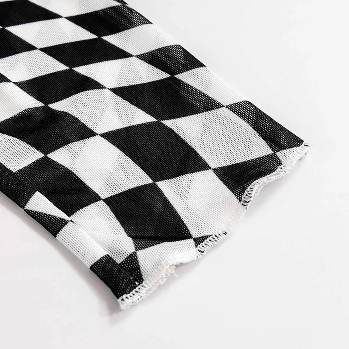 Black Checkered Pattern Mesh Mock Neck Long Sleeve Top for Women, Sheer Slim Fit Lettuce Edge Blouse for Daily Streetwear, Date Night & Fall Outings
