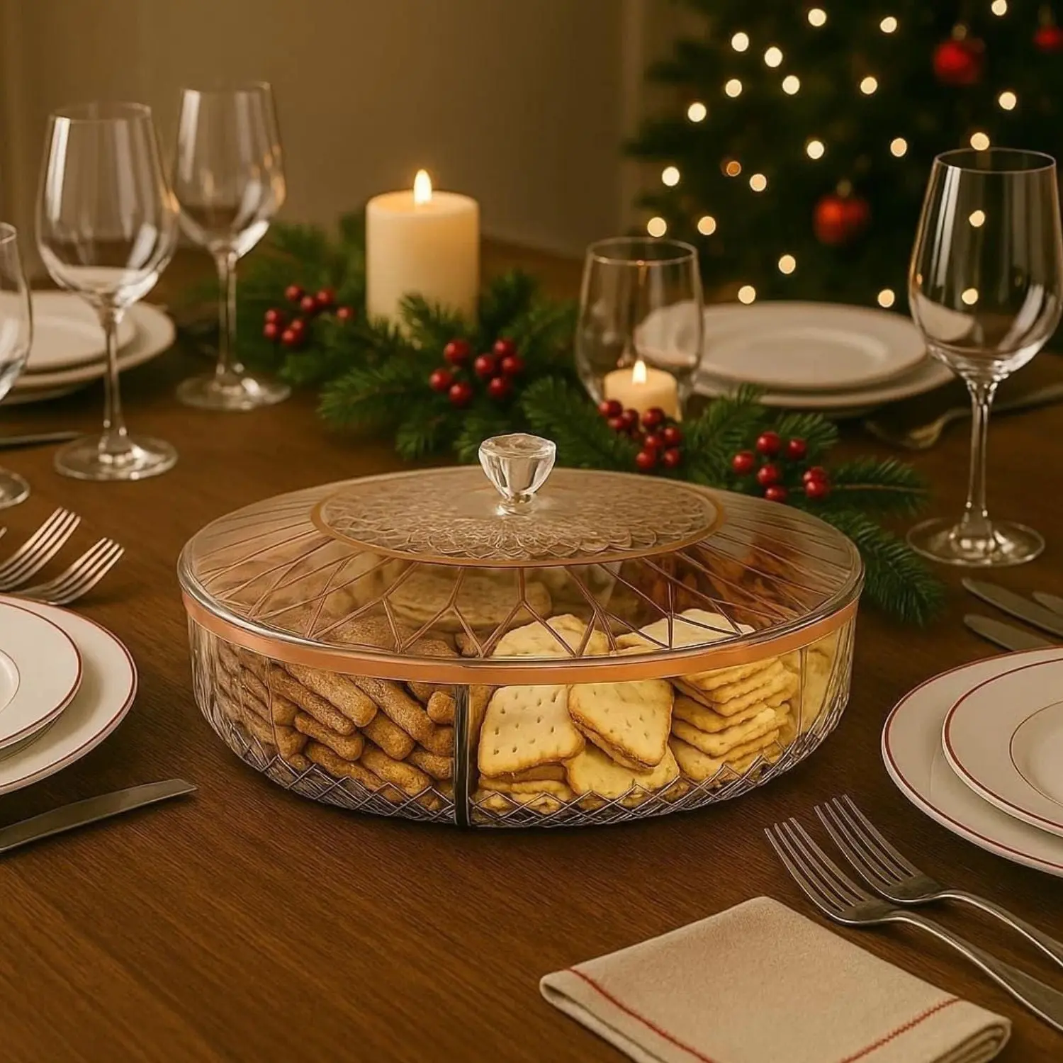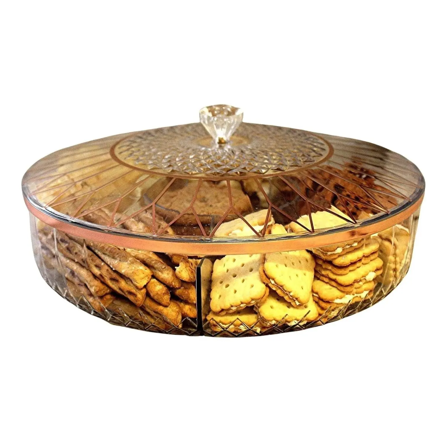 Elevate your entertaining with this clear divided snack serving tray featuring six compartments and a stylish rose gold design. Perfect for parties, gatherings, and everyday use, it keeps snacks neatly organized and easily accessible. The secure lid helps maintain freshness while preventing spills. Made from BPA-free materials, it’s durable, reusable, and ideal for serving a variety of treats.
