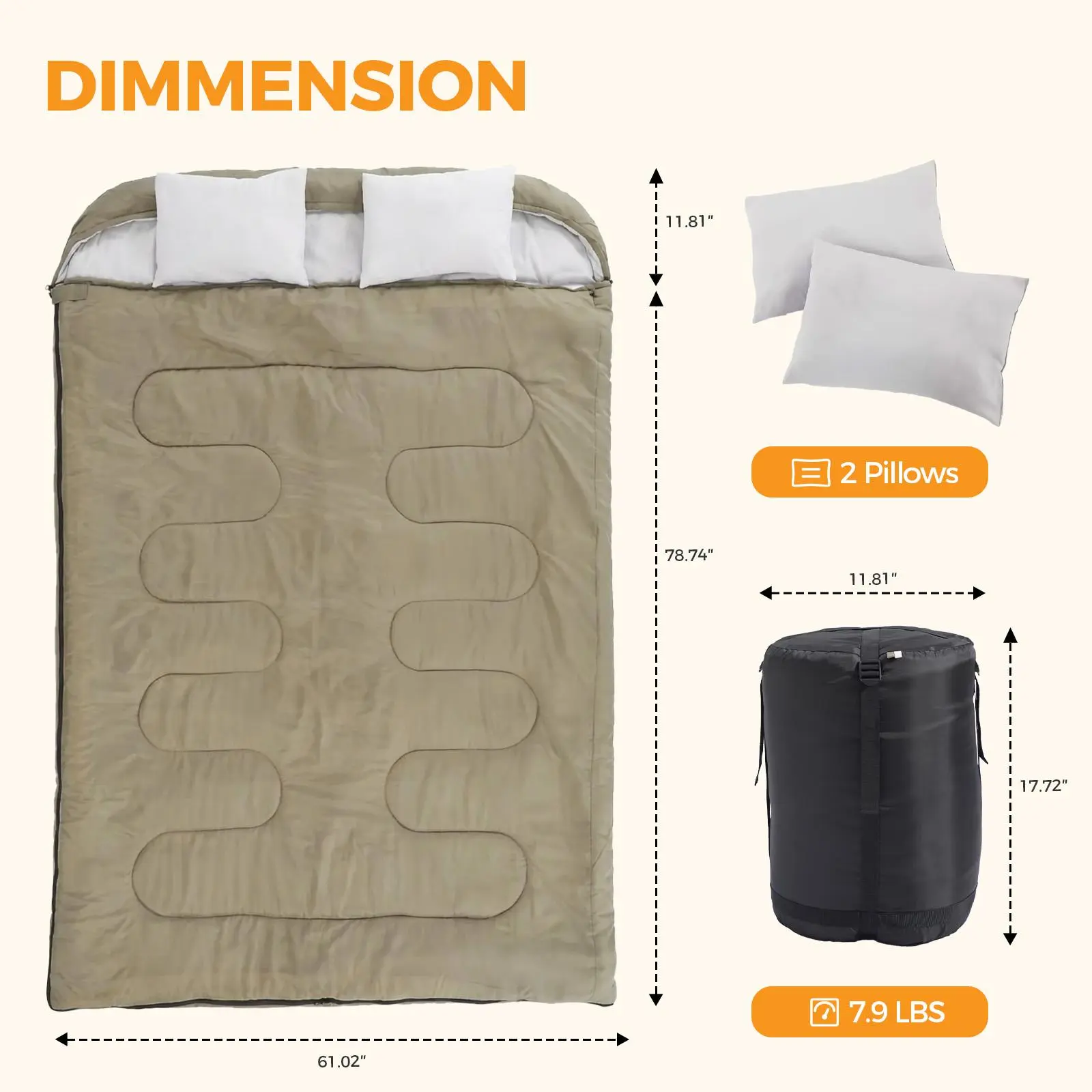This double sleeping bag comes with two soft camping pillows and features wraparound zippers. It can be separated into two individual sleeping bags or two queen-size blankets. Adapt to any situation – zip together for shared warmth or split apart for solo use. Ideal for outdoor adventures or indoor sleepovers.