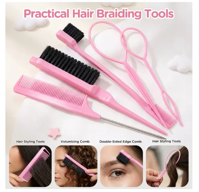 Crafted from flexible, high-quality rubber, these hair ties offer excellent stretch while being gentle on hair, minimizing breakage and discomfort. The set includes two sizes of topsy tail hair tools for creating inverted hairstyles, a teasing brush, a double-sided edge brush, a rat tail comb for detangling, and 40 hair clips for secure styling. Plus, a handy rubber band cutter is included to easily remove the elastics without pulling.