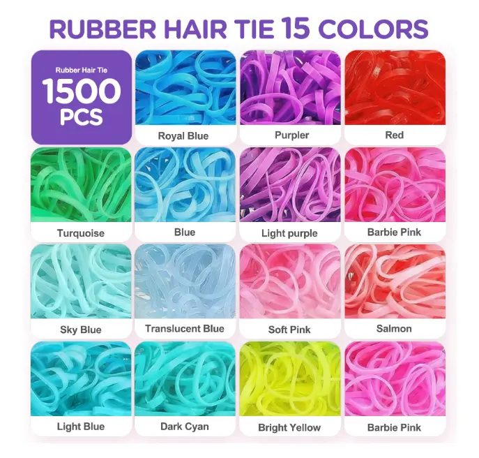 Keep every hairstyle neat and creative with this comprehensive 24-color hair ties and styling tools set. Featuring 1,695 durable elastic rubber bands in a vibrant rainbow of colors, this kit is perfect for toddlers, girls, and women of all ages. Whether you're styling ponytails, braids, or trendy updos, the included hair tools make it easy and comfortable to achieve the perfect look.