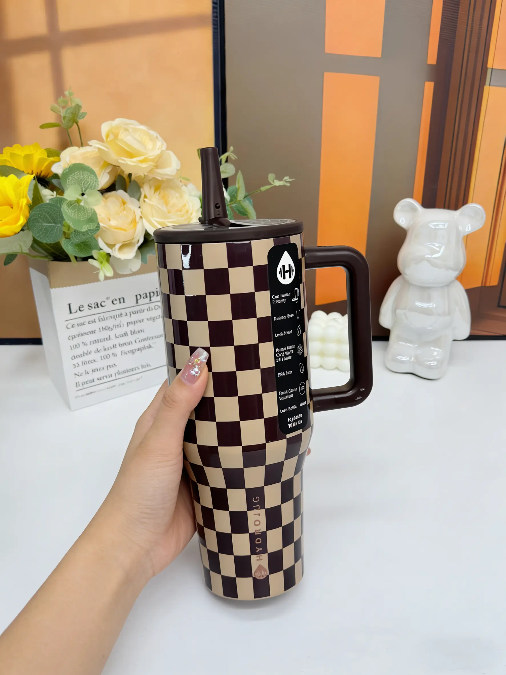 This Hydrojug 40oz Insulated Tumbler is ideal for travel, gym, camping, and daily use. It features a brown checkerboard design, making it stylish and practical. The tumbler includes a handle and straw for easy handling. The leakproof lid ensures your drinks stay contained. BPA-free, it's safe for everyday use. 🚗💪🏕️