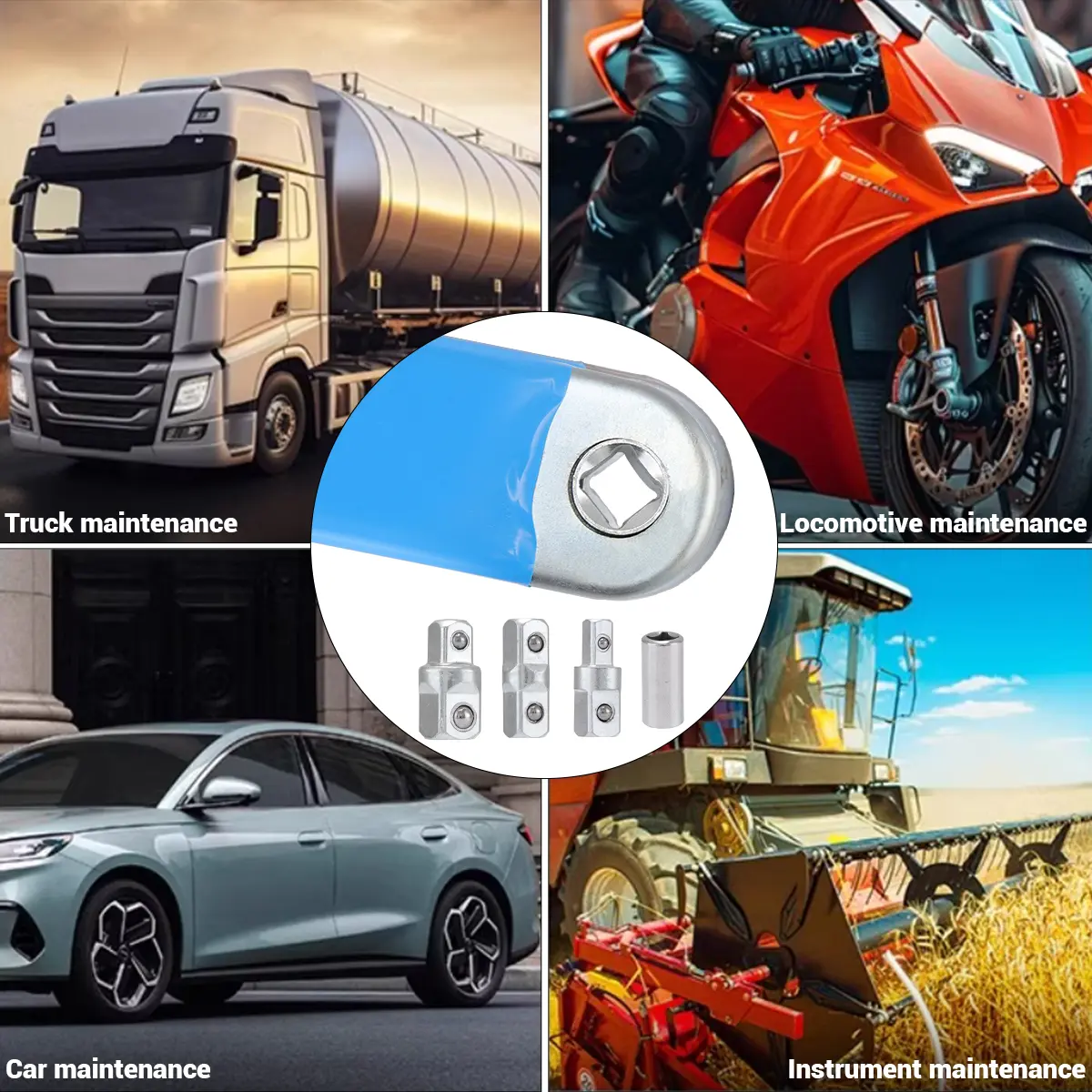 Equipped with four adapters: 1/4 electric ratchet socket, 3/8 to 3/8 adapter, 3/8 hole to 1/2 head, and 3/8 hole to 1/4 head. Ideal for automotive repairs and home renovations.