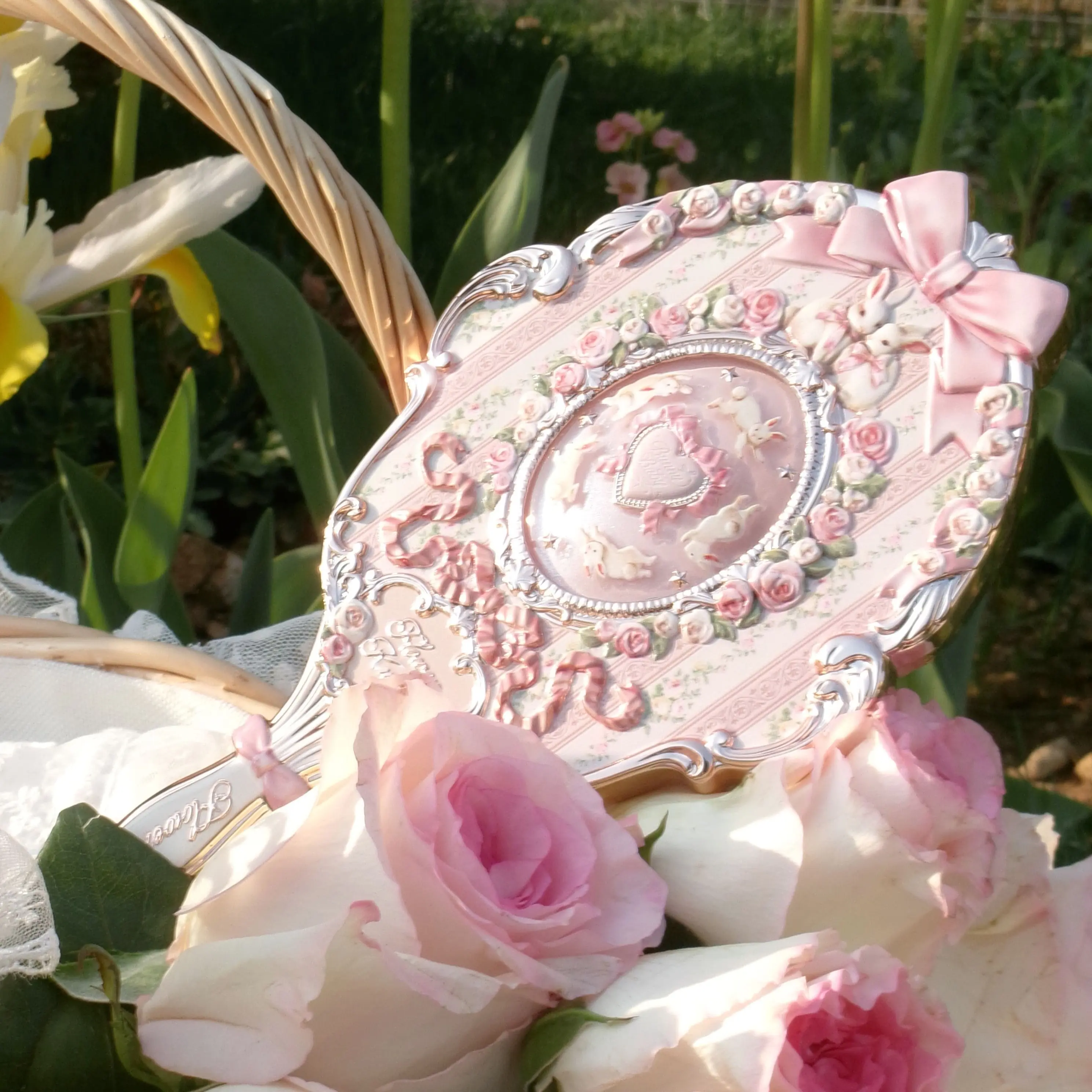 This mirror is so incredibly beautiful! It is the perfect size for traveling and is incredibly detailed. As for the bow, it isn't connected to the mirror itself and can be easily adjusted to the very top of the handle! Overall, it's sooo gorgeous!
