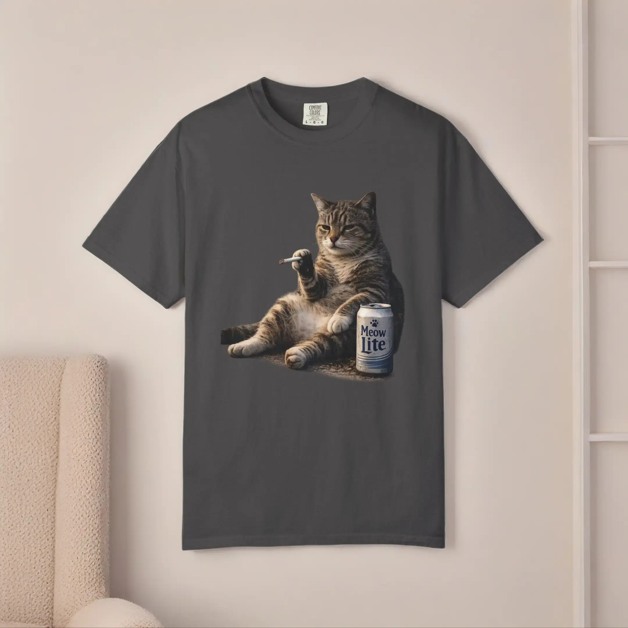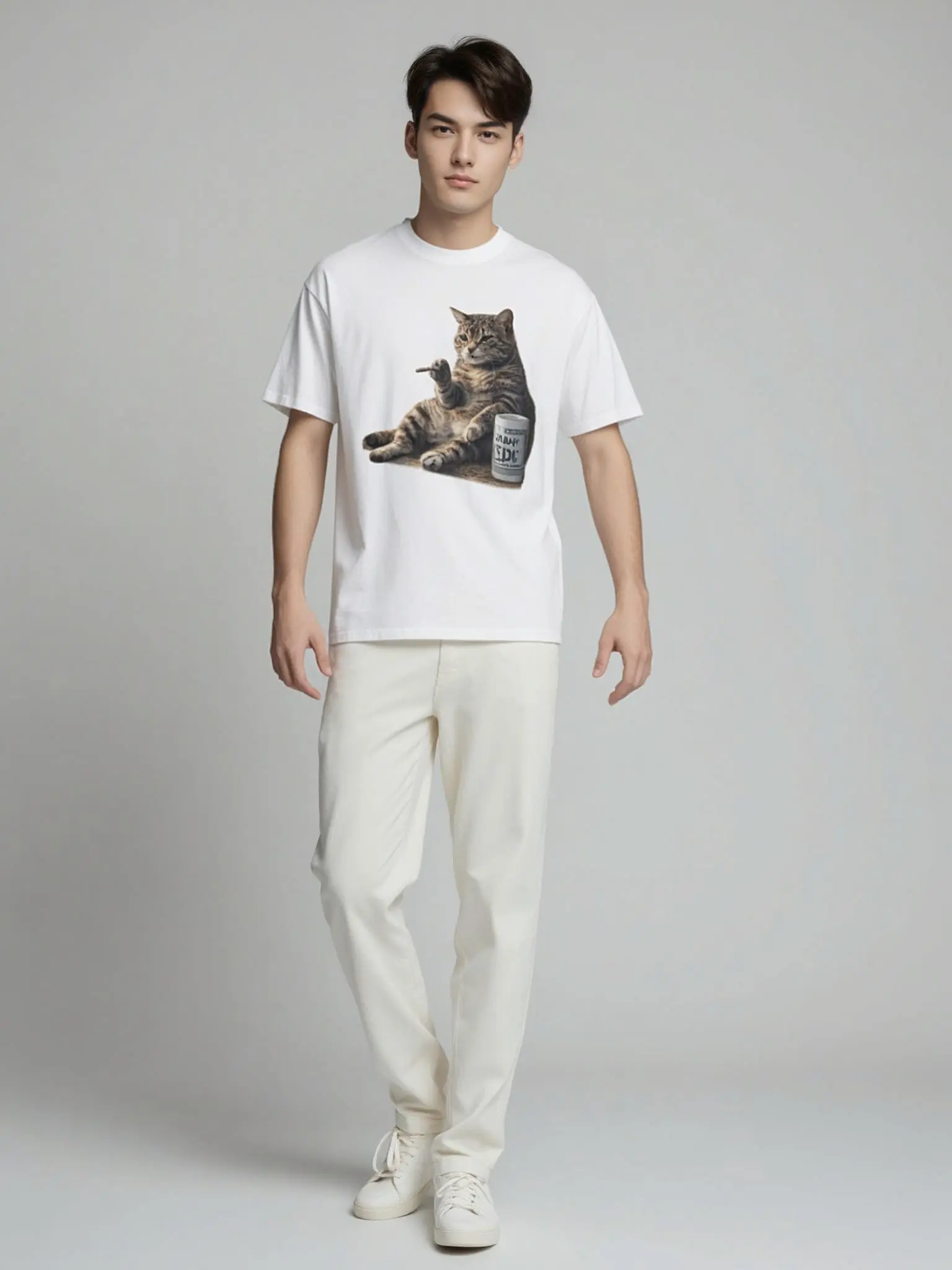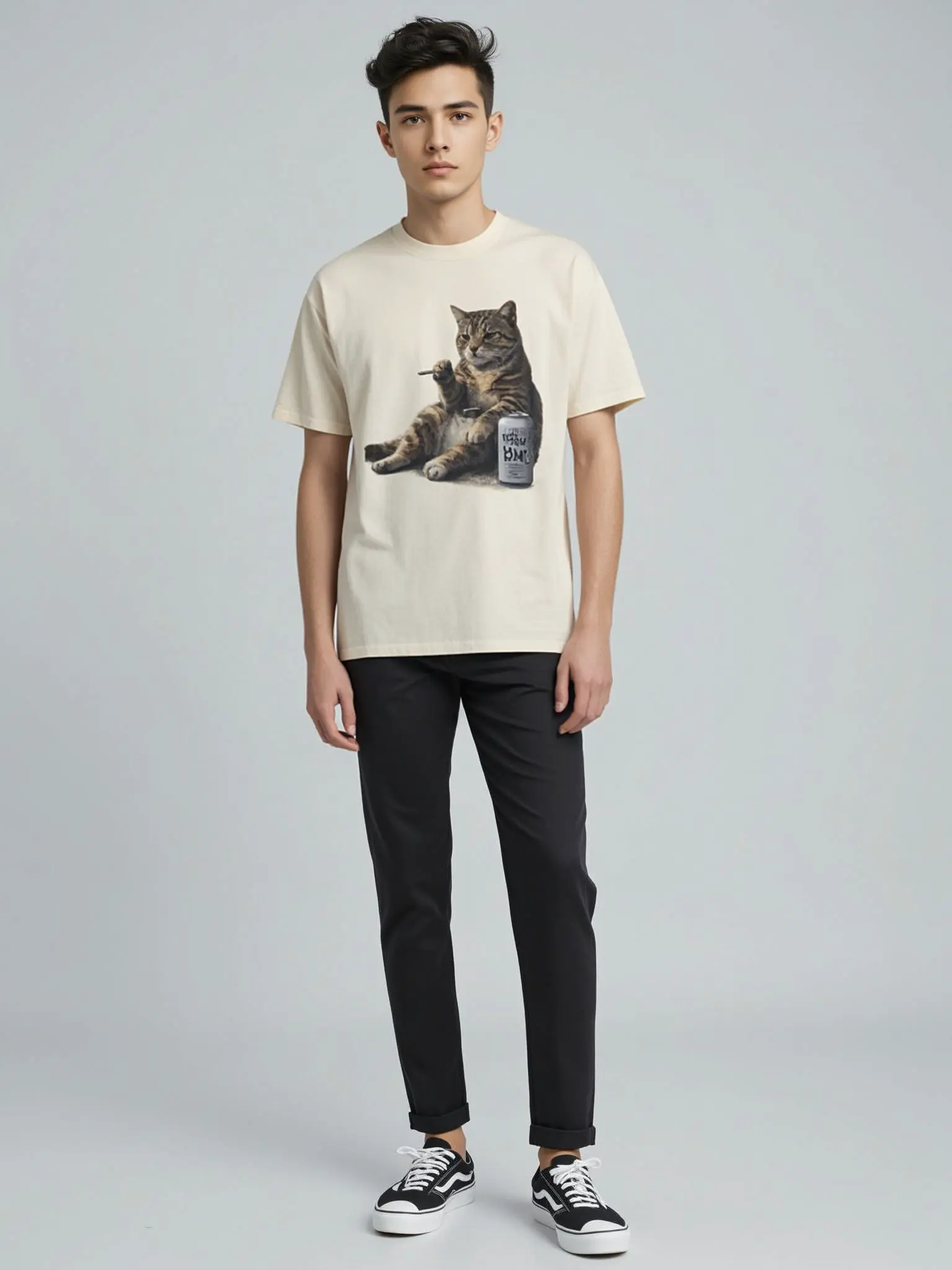 A relaxed, garment-dyed tee that brings a wry, cozy vibe to lazy afternoons and low-key hangouts. The soft, broken-in feel of the heavyweight cotton invites you to sink into the couch with a purring companion and a cold drink. The printed scene — a chilled tabby holding a tiny cigarette and a can beside it — reads like a private joke between friends, adding a wink of irreverence to your everyday wardrobe. Wear it with worn denim or over pajamas when you want to lean into comfort and humor without trying too hard. The roomy fit and durable construction mean this shirt becomes more lived-in and characterful after every wash.