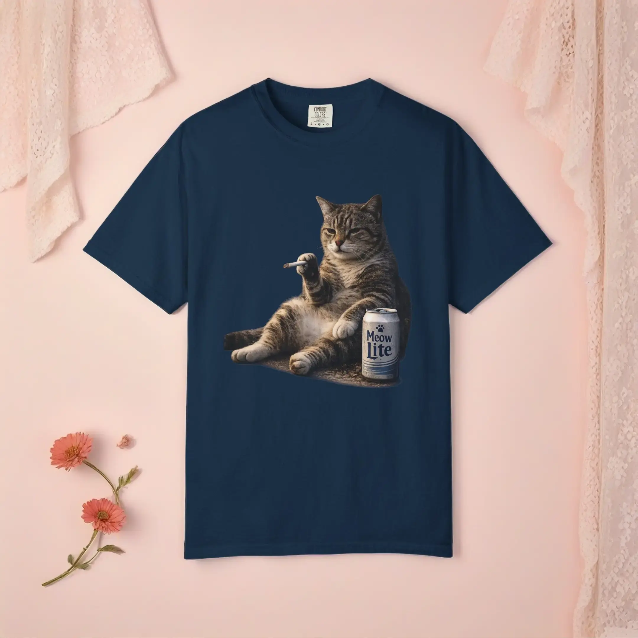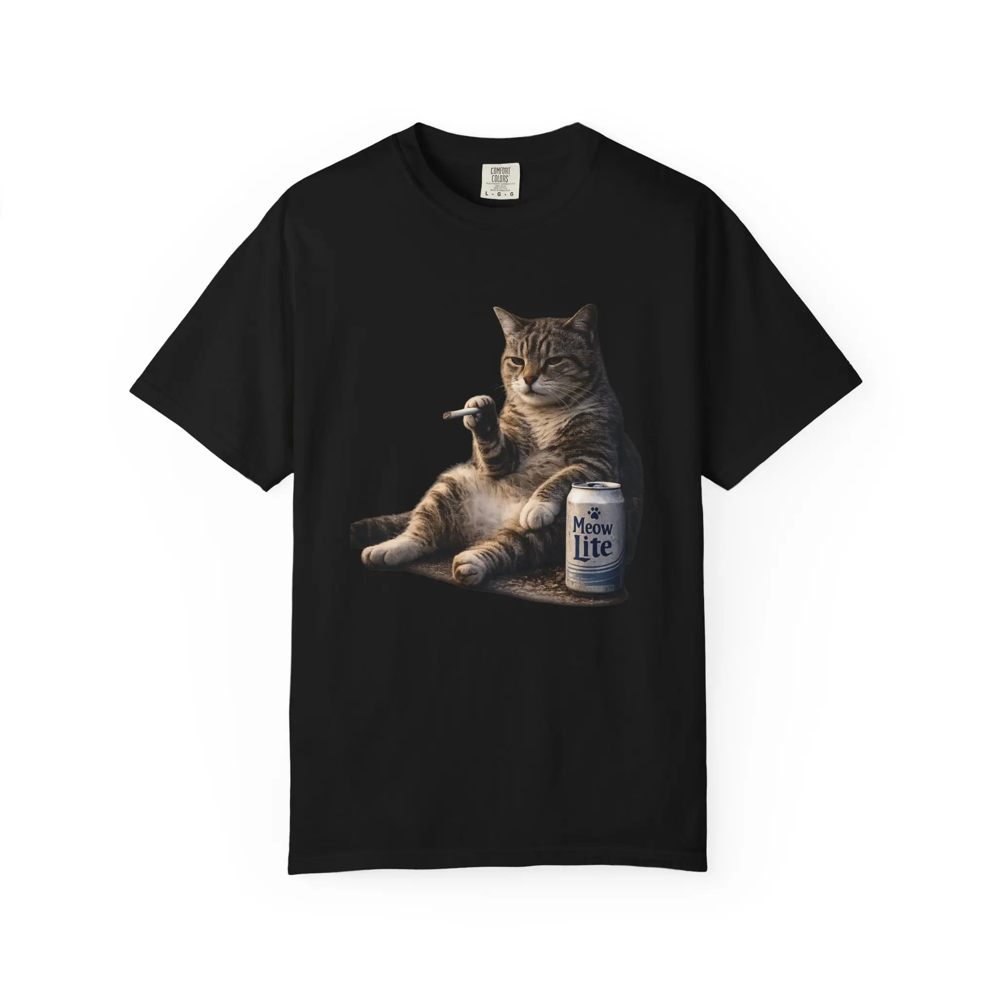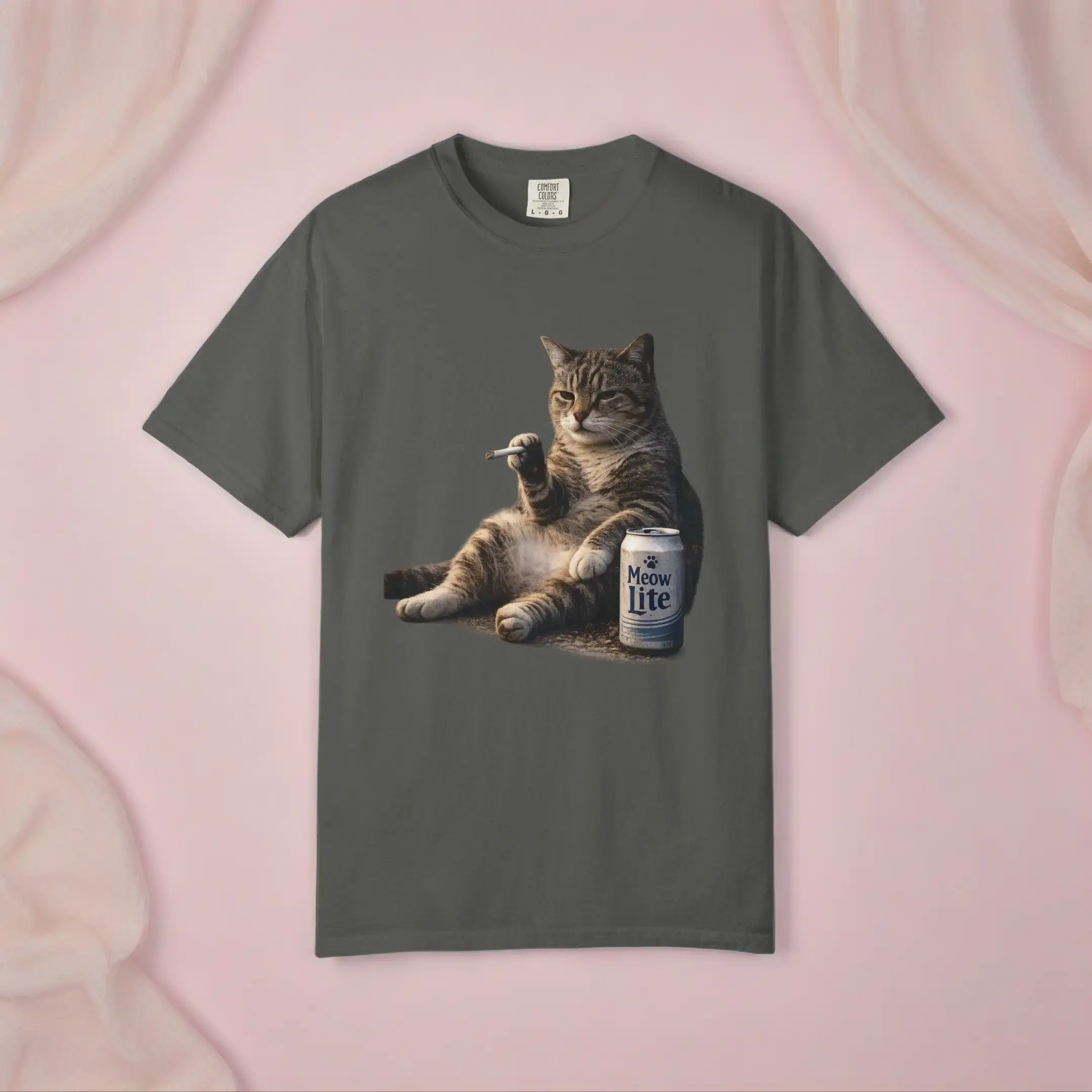 A relaxed, garment-dyed tee that brings a wry, cozy vibe to lazy afternoons and low-key hangouts. The soft, broken-in feel of the heavyweight cotton invites you to sink into the couch with a purring companion and a cold drink. The printed scene — a chilled tabby holding a tiny cigarette and a can beside it — reads like a private joke between friends, adding a wink of irreverence to your everyday wardrobe. Wear it with worn denim or over pajamas when you want to lean into comfort and humor without trying too hard. The roomy fit and durable construction mean this shirt becomes more lived-in and characterful after every wash.