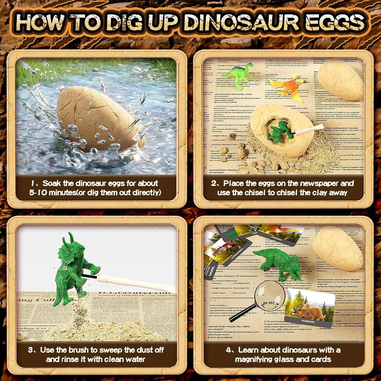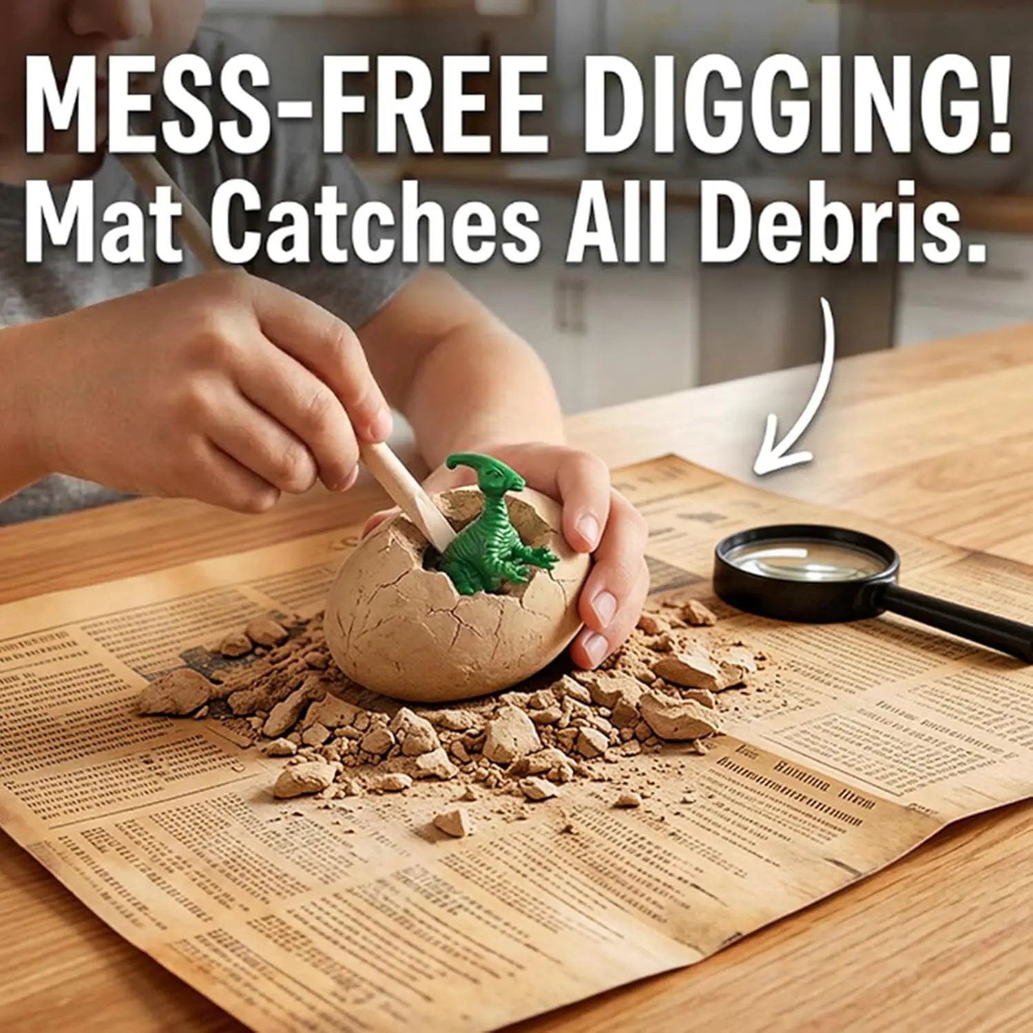 ·INCLUDES EXCLUSIVE "MESS-FREE" MAT – Say goodbye to dusty tables. Unlike other kits, our set includes a specially designed excavation mat (Styled like an old newspaper, the content is a report about dinosaurs) to catch all the debris and plaster dust. Parents love the easy cleanup—simply fold up the mat and toss the dust, keeping your home spotless after the fun.(You can soak the dinosaur eggs in water for 5-10 minutes before digging to make it easier.)