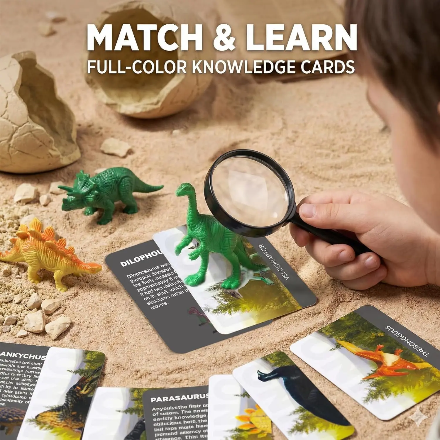 ·DISCOVER, LEARN & MATCH – We turn simple digging into a hands-on archaeological science lesson. After digging out the dinosaur, you can use a magnifying glass to observe the details of the dinosaur and combine it with the card to determine the name of the dinosaur. Each card reveals the dinosaur's history and characteristics, fostering a love for paleontology and biology while training fine motor skills and patience.