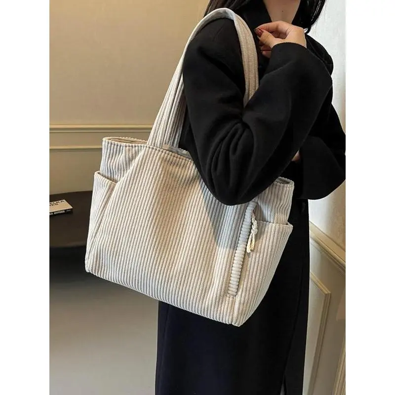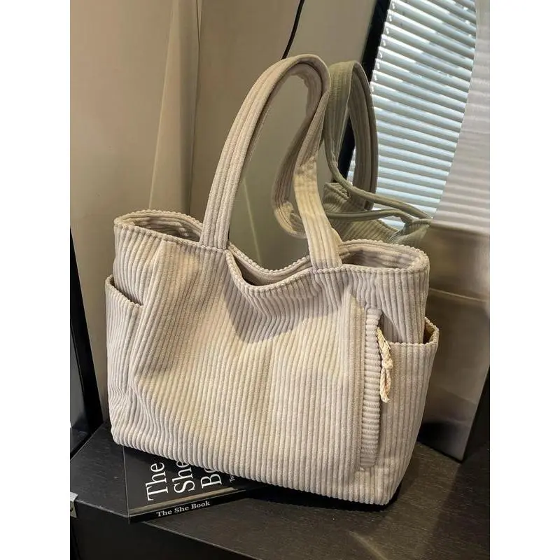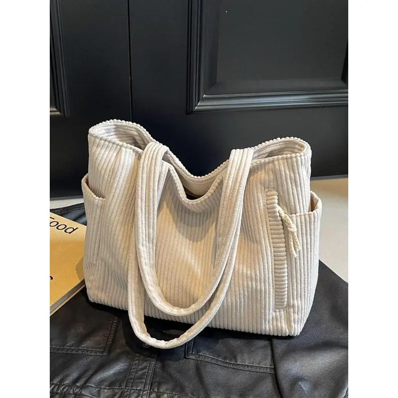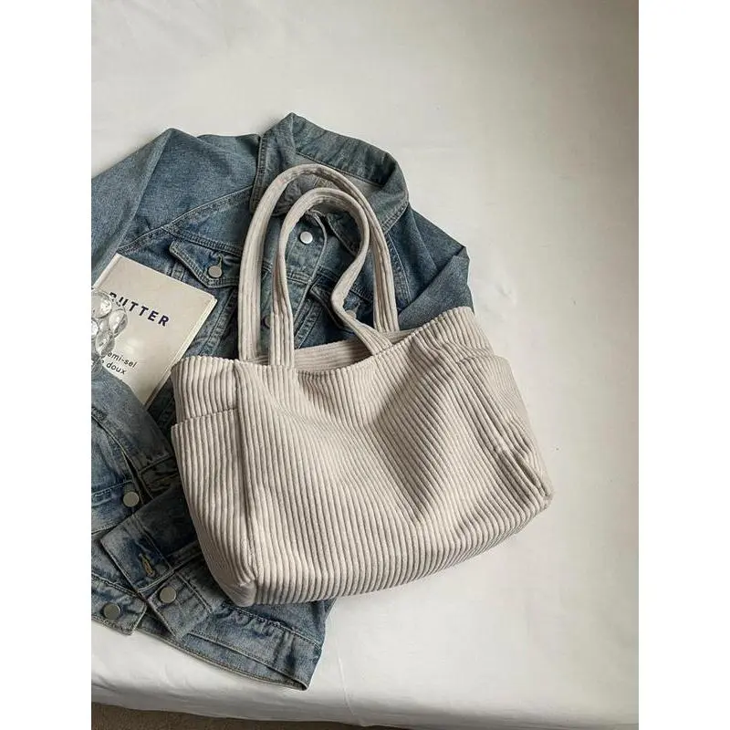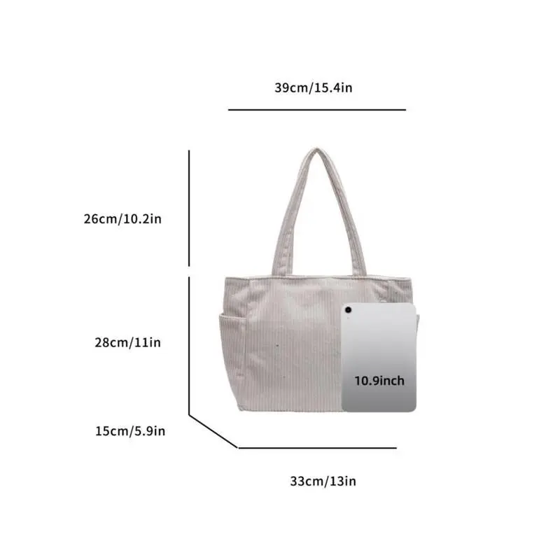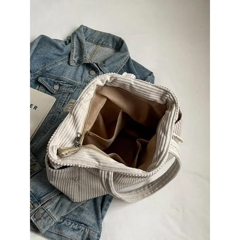 Elevate your daily carry with this ultra-versatile cream corduroy tote, made for the modern American woman balancing work, school, and busy on-the-go life.Crafted from soft, durable corduroy fabric, this bag features a minimalist, oversized design that exudes effortless casual chic. The spacious main compartment easily fits your laptop, notebooks, textbooks, work essentials, and even a water bottle or lunch, making it perfect for commuting, campus days, or weekend errands.The convenient zippered side pocket keeps your phone, keys, or wallet secure and within easy reach, while two open side pockets offer quick access to small items like lip balm or hand sanitizer. The wide, padded shoulder straps ensure all-day comfort, even when fully loaded, and the lightweight, flexible material makes it easy to fold and store when not in use.Timeless, durable, and endlessly stylish, this corduroy tote transitions seamlessly from the office to the classroom to casual outings, pairing flawlessly with every outfit. Whether youre heading to work, class, or a coffee run, its your new go-to daily carryall.Grab yours now and upgrade your everyday style!