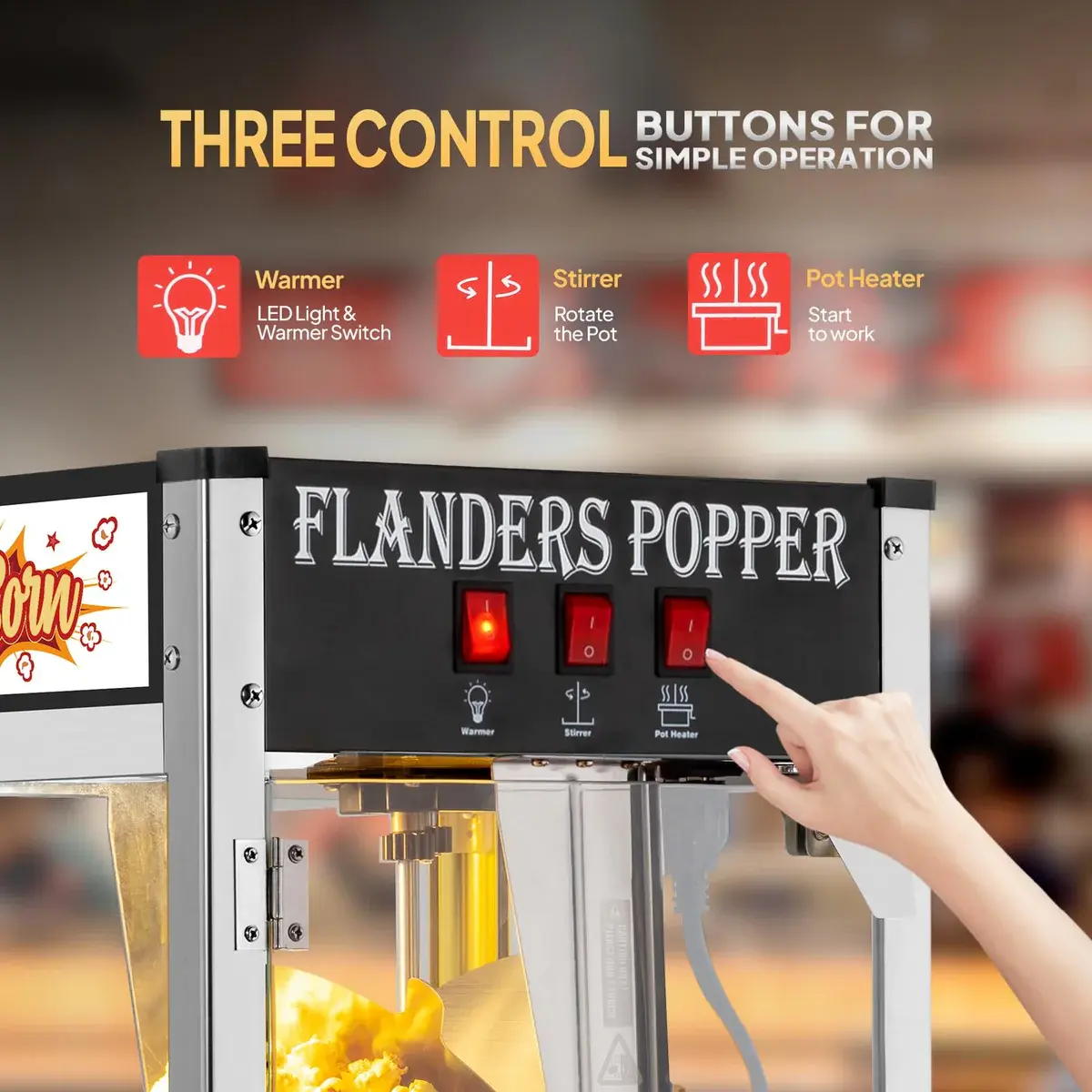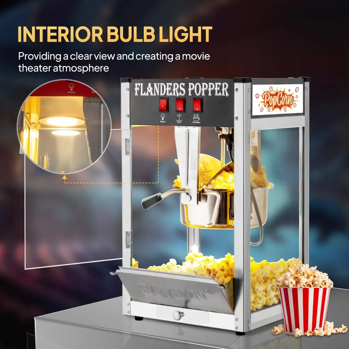 2. 3 Control Switches: The countertop popcorn maker machine is designed with 3 control switches for controlling the warmer, stirrer, pot heater separately, which makes the operation more convenient. Besides, it is designed with an interior LED light for providing a clear view and also creating a movie theater atmosphere.