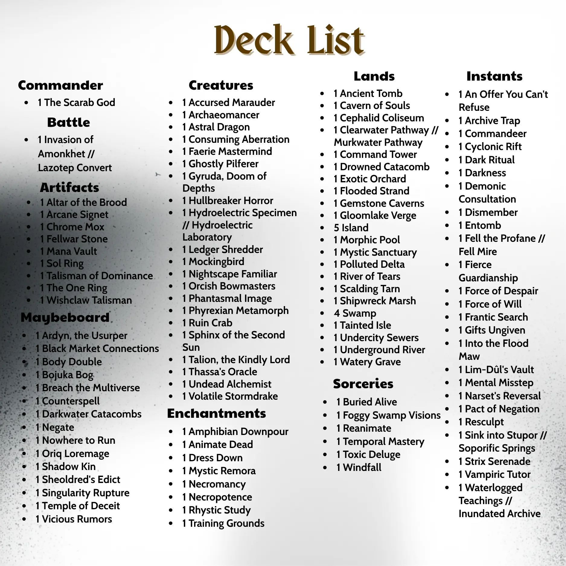 The Scarab God Zombie deck is built around The Scarab God in Magic: The Gathering. This Dimir (blue–black) strategy blends Zombie tribal, graveyard control, and value reanimation, creating a slow but inevitable “apocalypse” that overwhelms opponents over time.