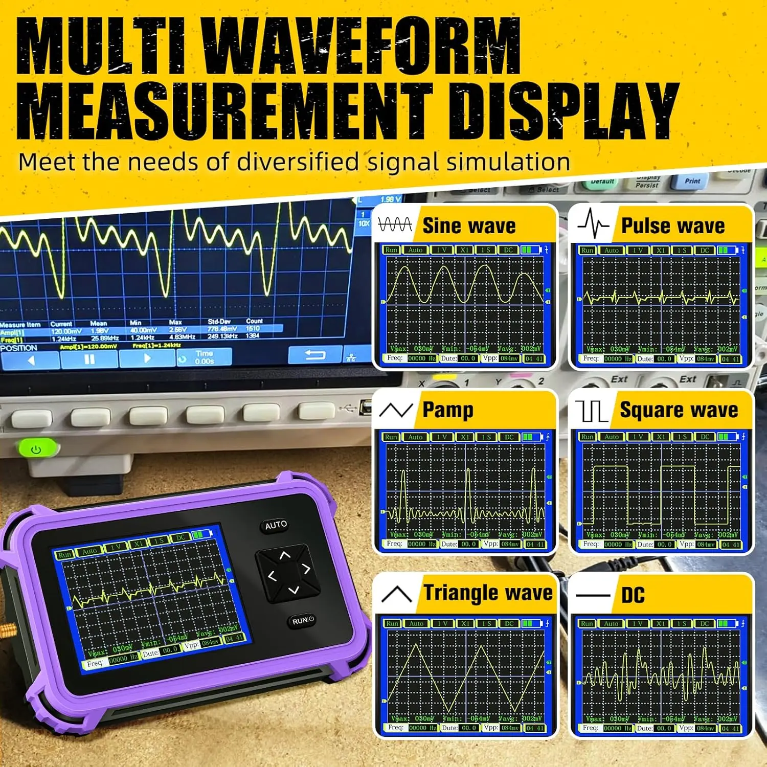 Please NOTE: Our handheld oscilloscope comes with an MCX probe cable, which supports measurements up to 40V.If you need to measure higher voltages, please use a high-voltage probe and adjust it to x10 mode to ensure accurate measurements and the safety of the oscilloscopeHigh-Precision Real-Time Sampling: This mini pocket oscilloscope features 8.33 MSa/s sampling and 1 MHz bandwidth, ensuring precise capture of sine waves and electrical signals.Perfect for diagnosing circuits, troubleshooting and electronic testing3 Trigger Modes & One-Key AUTO: Portable oscilloscope with three trigger modes: Auto/Normal/Single, along with a convenient one-touch auto setup, ensuring stable waveform capture for repetitive signals, transient events, and quick diagnostics.Our digital scope is designed for both beginner and professionalsOscilloscope Multimeter: The handheld osciloscopio equipped with x1 and x10 probe modes, supporting a wide range of voltage inputs.Built-in high-voltage protection, the voltmeter can safely measure voltages up to 400V, making it ideal for both low and high voltage measurementRechargeable & Long-Lasting: The automotive oscilloscope features a built-in 1200 mAh high-capacity rechargeable battery.Once fully charged, this lab scope meter can measure continuously for up to 8 hours.It also includes low battery indication and an auto power-off function to extend battery lifeCompact & Portable: This pocket oscilloscope features a 2.8-inch TFT display with 320*240 resolution, ensuring clear signal monitoring even in low-light conditions. Lightweight and easy to carry, it supports a variety of waveform measurements, including frequency, duty cycle, peak-to-peak voltage, and max/min/avg voltage measurement