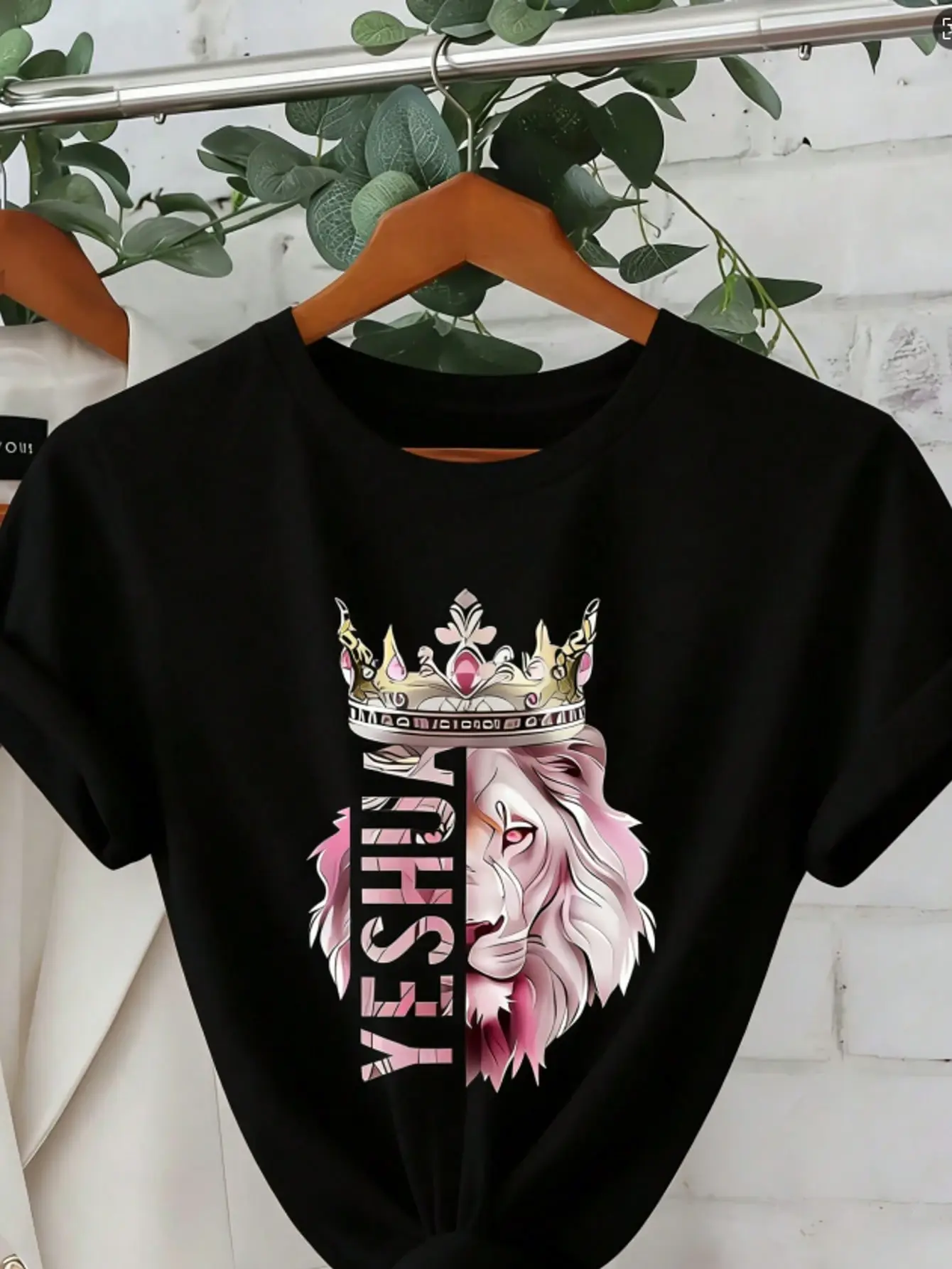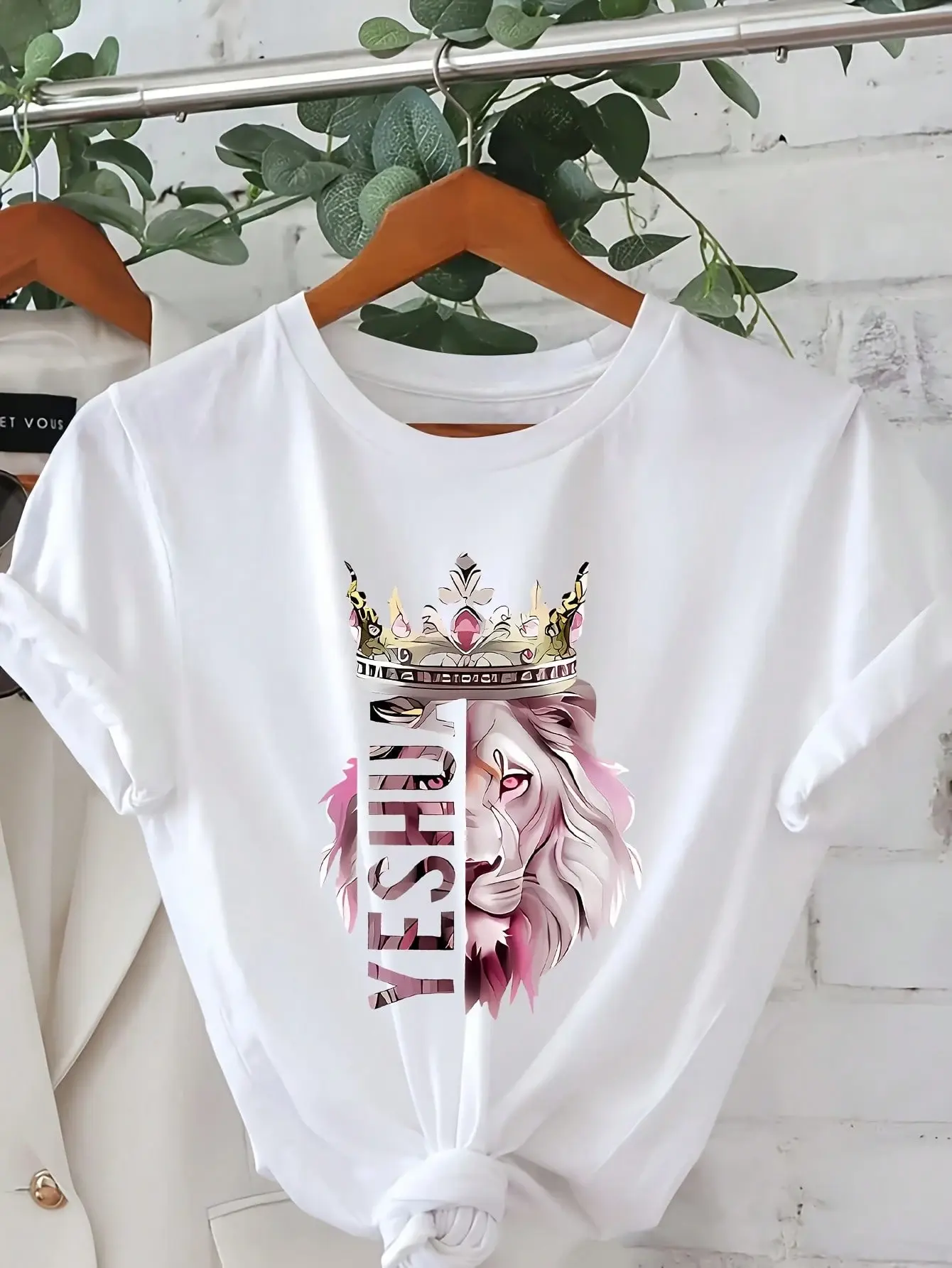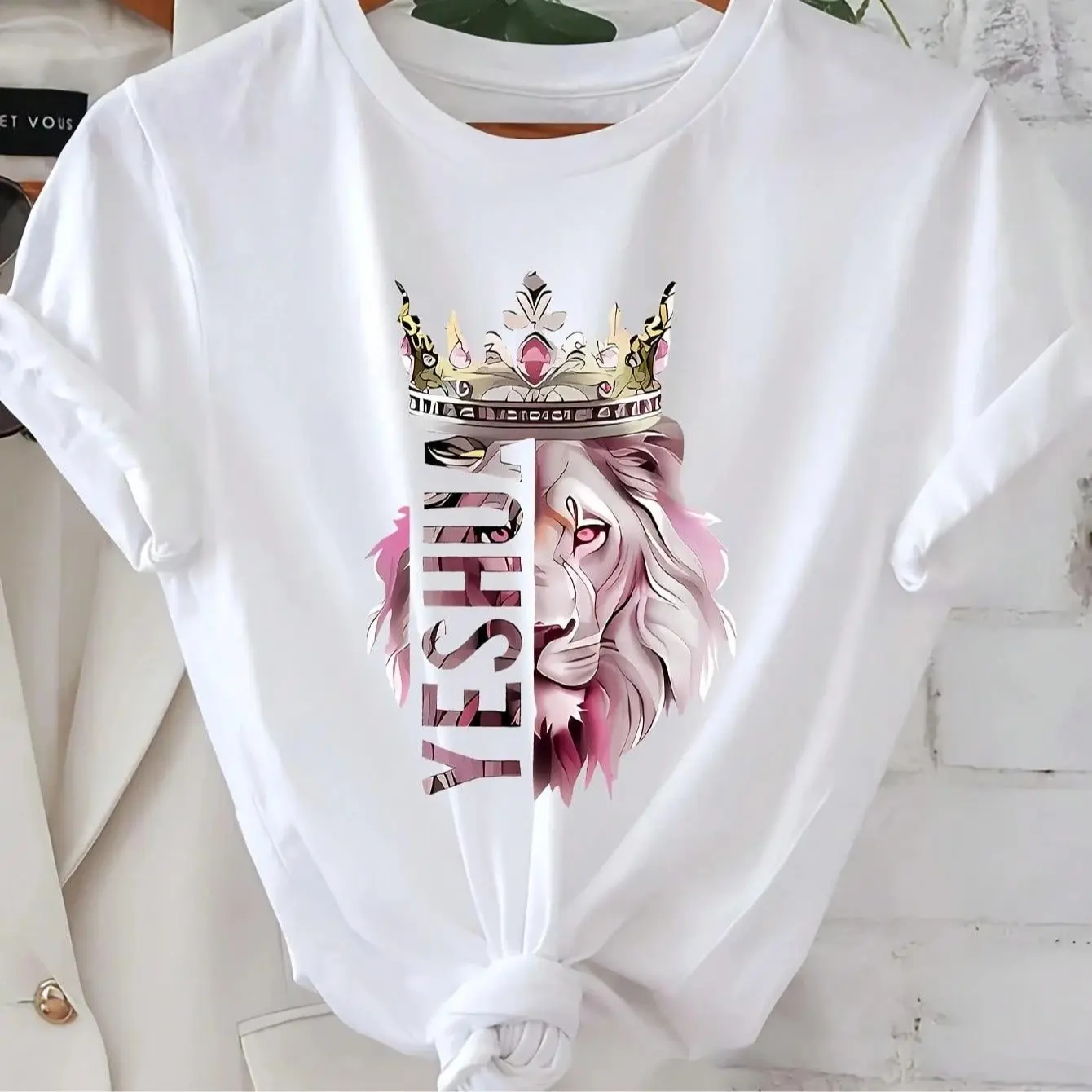 Women's T-Shirt With Lion King Crown And Lioness Pattern - Beige With Pink And Gold Letters, Short Sleeve Round Neck Casual Spring Summer Top, Christian Faith Clothing With Text (Design Of Lion Of Judah And Joshua), Opaque Fabric, Loose Fit,