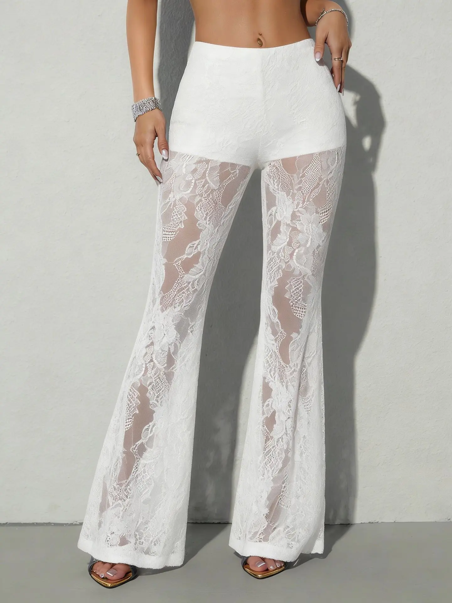 The pants feature a high-waisted silhouette that cinches at your natural waist to create a leg-lengthening effect, paired with a form-fitting straight leg that flares dramatically at the hem for a retro, 70s-inspired silhouette. The intricate floral lace pattern adds depth, texture, and a subtle sheer effect that balances romance and edge, while the sheer fabric lends a bold, alluring touch that showcases your legs from every angle. Available in two timeless, versatile hues—jet black and pure white—these pants transition effortlessly from beach days, music festivals, and date nights to club nights and vacation getaways.