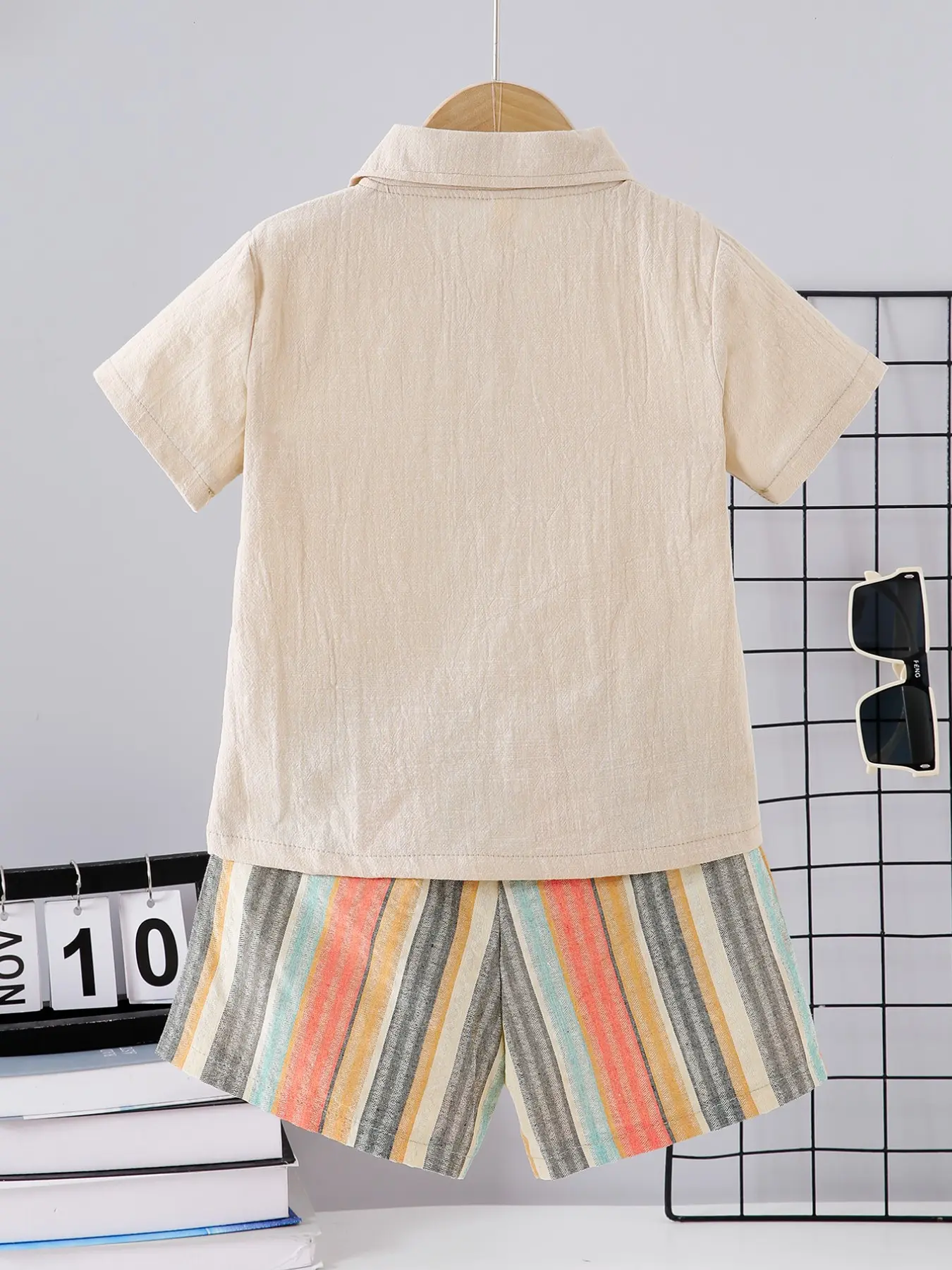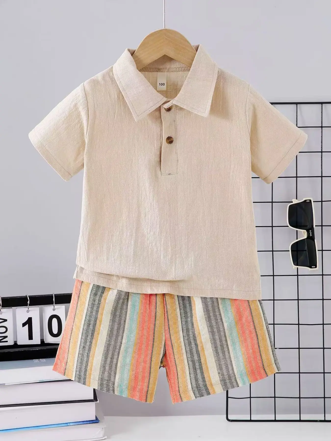 Boys' Summer New Solid Color Collar Button Polo Shirt, Short Sleeve Colorful Vertical Stripes, Casual Outdoor Wear, 2 Pieces Set