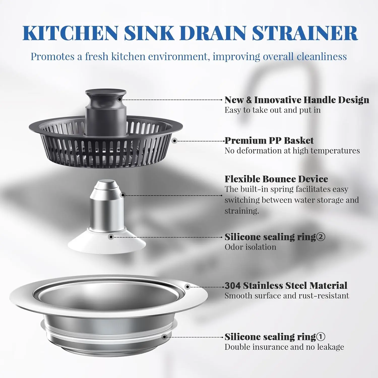 This sink drain strainer combines water storage, straining, and odor isolation. Its pop-up design simplifies tasks with a button press. It includes a drain basket to catch food residue. Perfect for American standard 3-1/2 inch sinks, it fits diameters 2.92 - 3.38 inches and depths over 1.37 inches. Measure before buying.