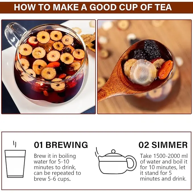 Smooth, Enjoyable Taste: Experience a well-balanced cup with the natural sweetness of red dates and mulberries, complemented by the earthy richness of ginseng and Polygonatum. The deep, full-bodied infusion offers a flavorful yet refreshing experience any time of day.