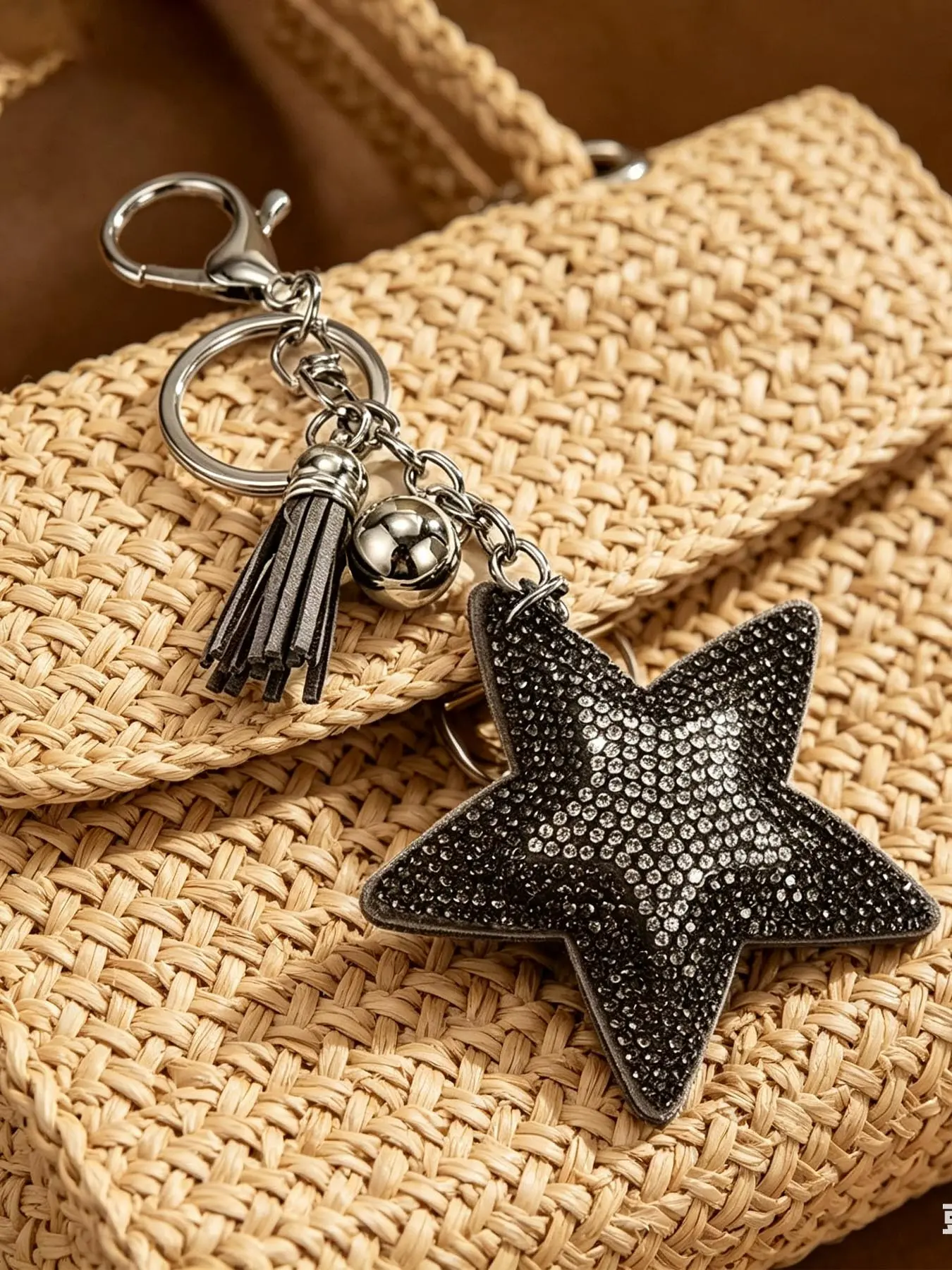 5. Elegant Two-Tone Rhinestone Star Sequin Keychain, Boho Style Beach Bag Charm, Dual-Sided Design, Fringe Key Ring Accessory