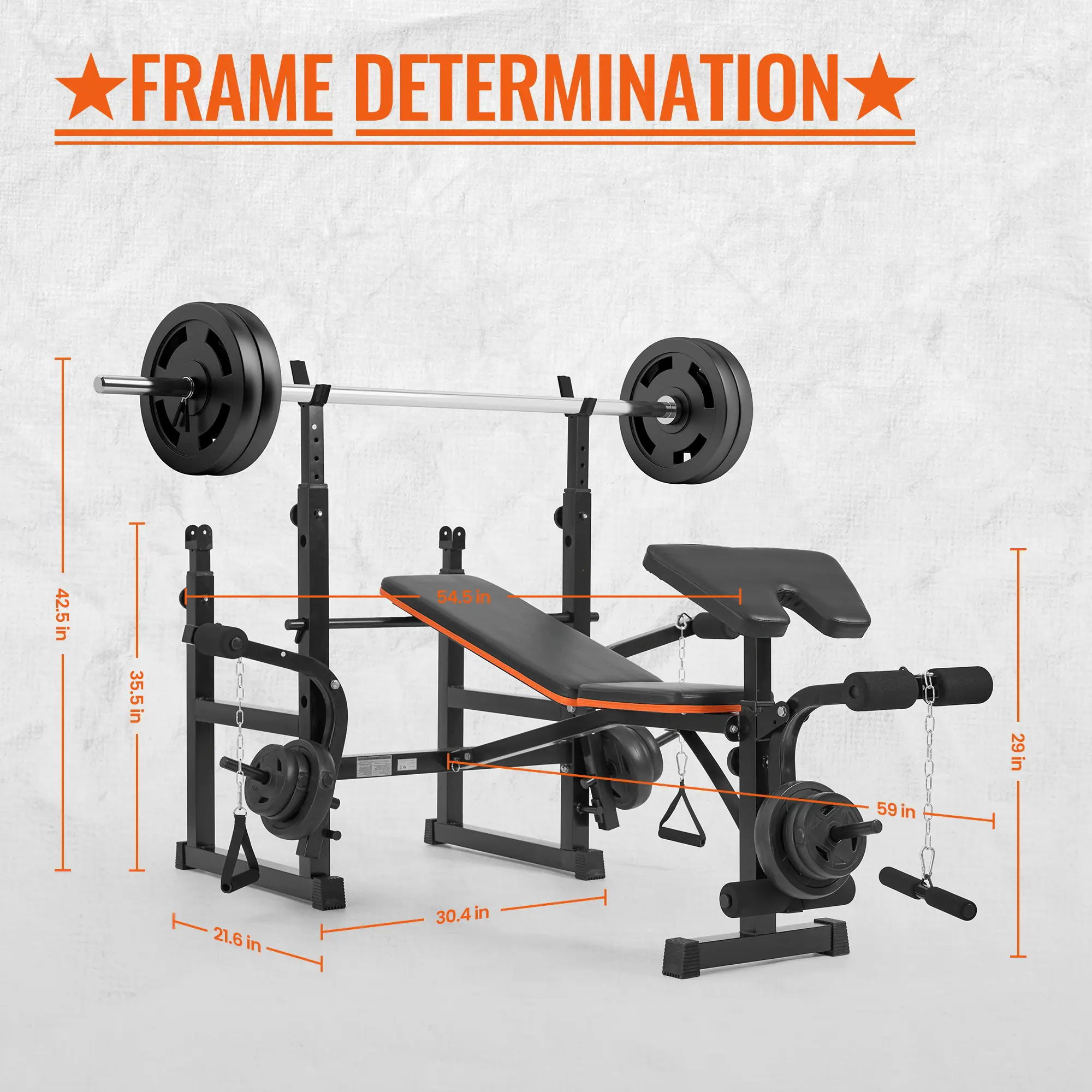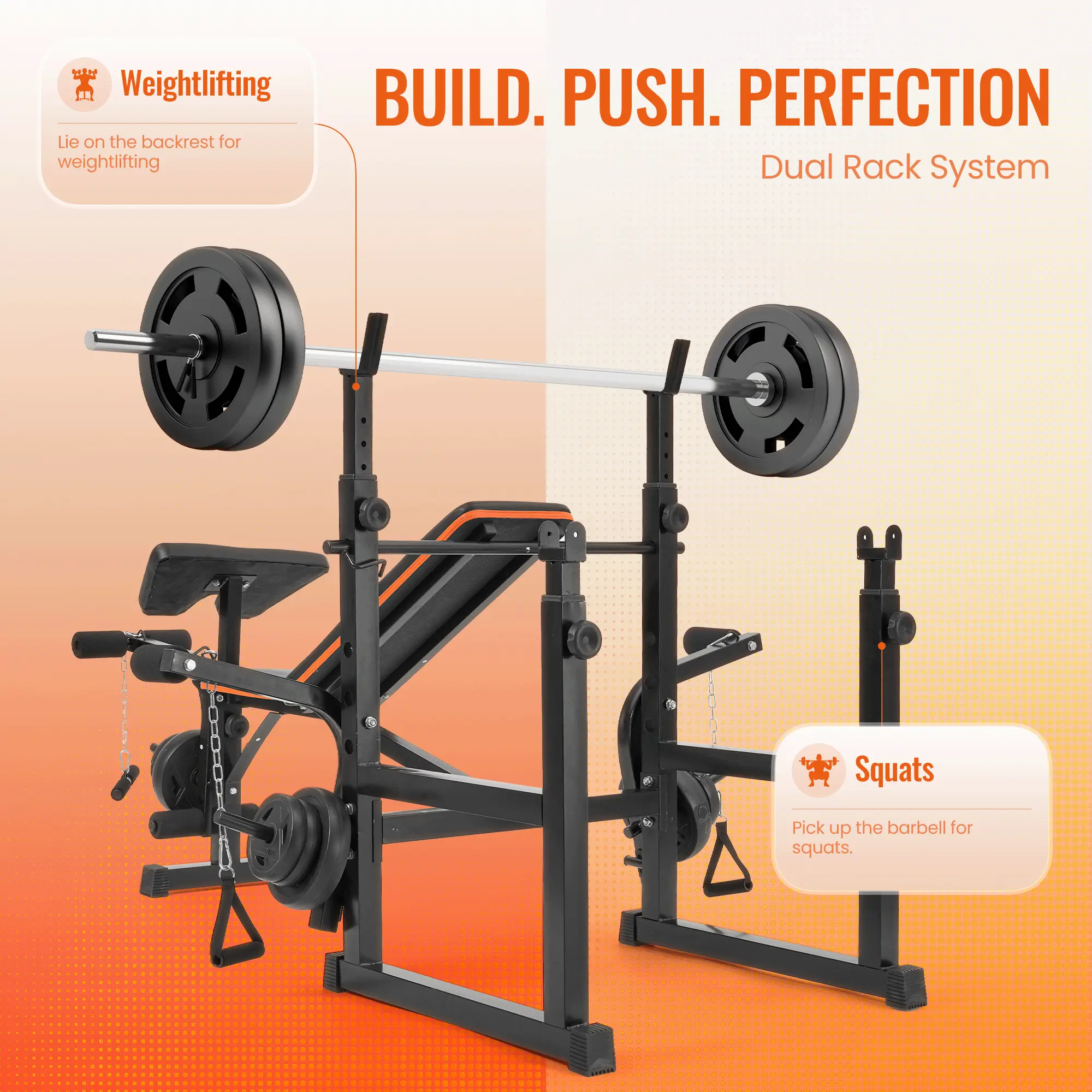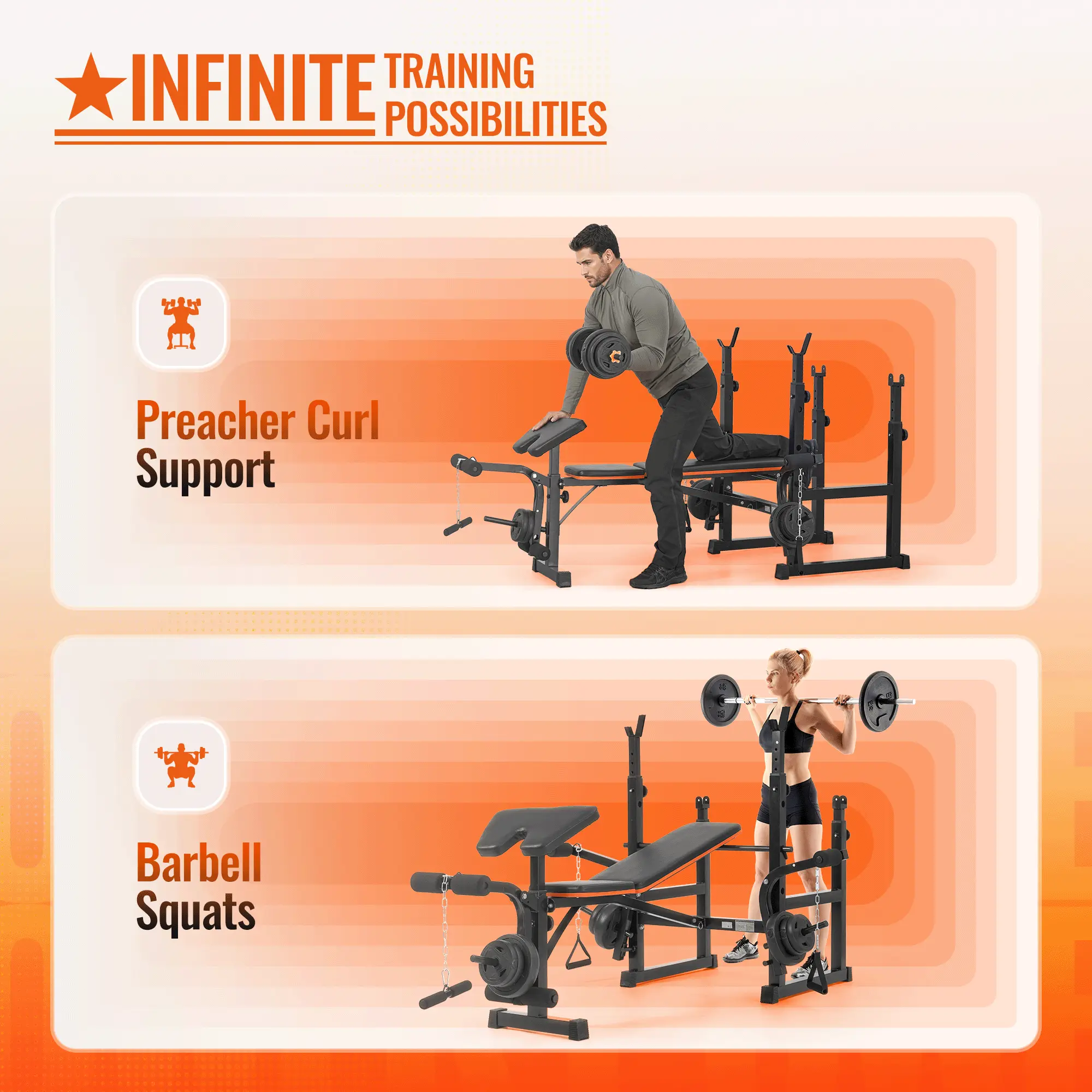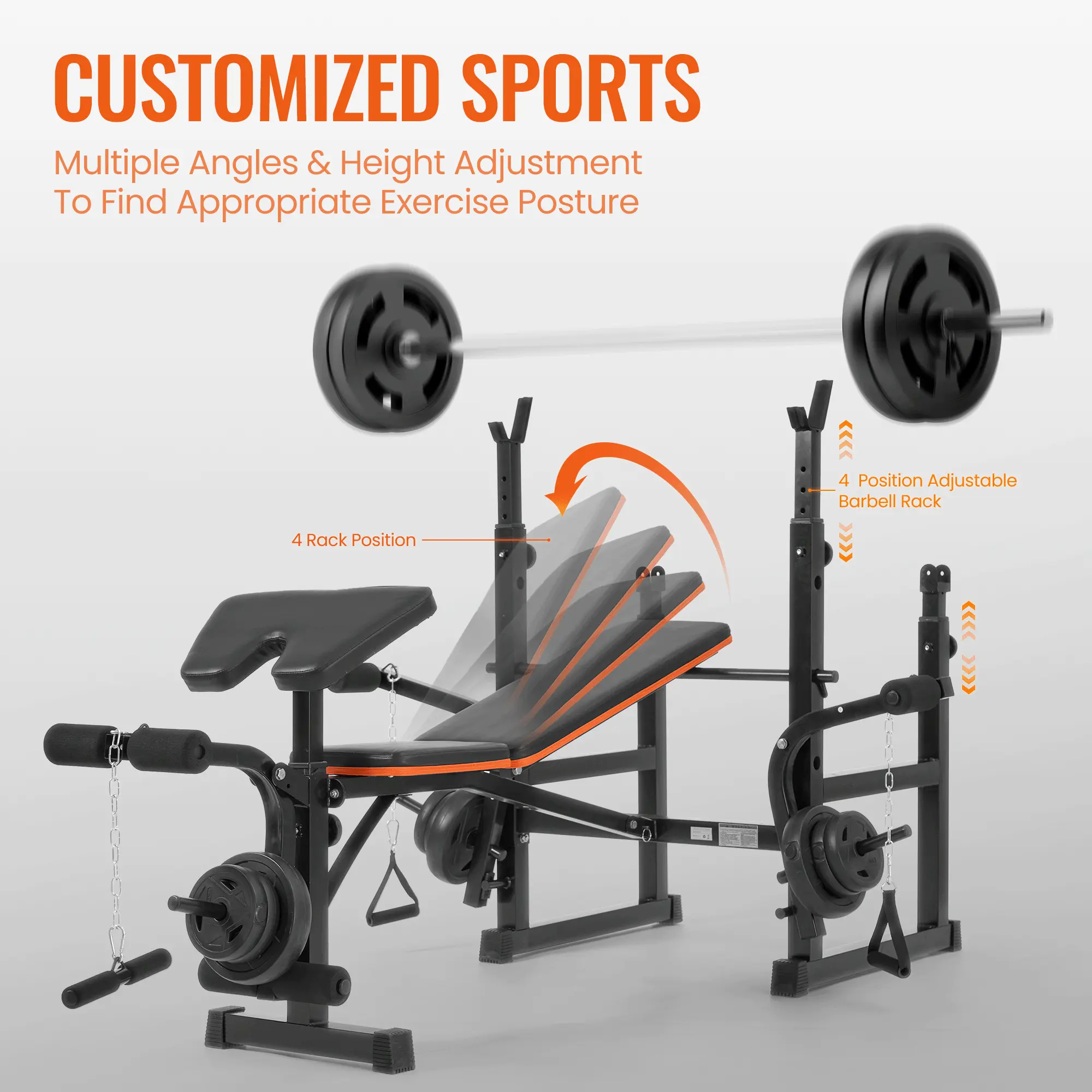 ·Adjustable Design: Features 5-level height adjustable barbell racks and a 4-level adjustable backrest, accommodating various user heights and training preferences for personalized workouts.