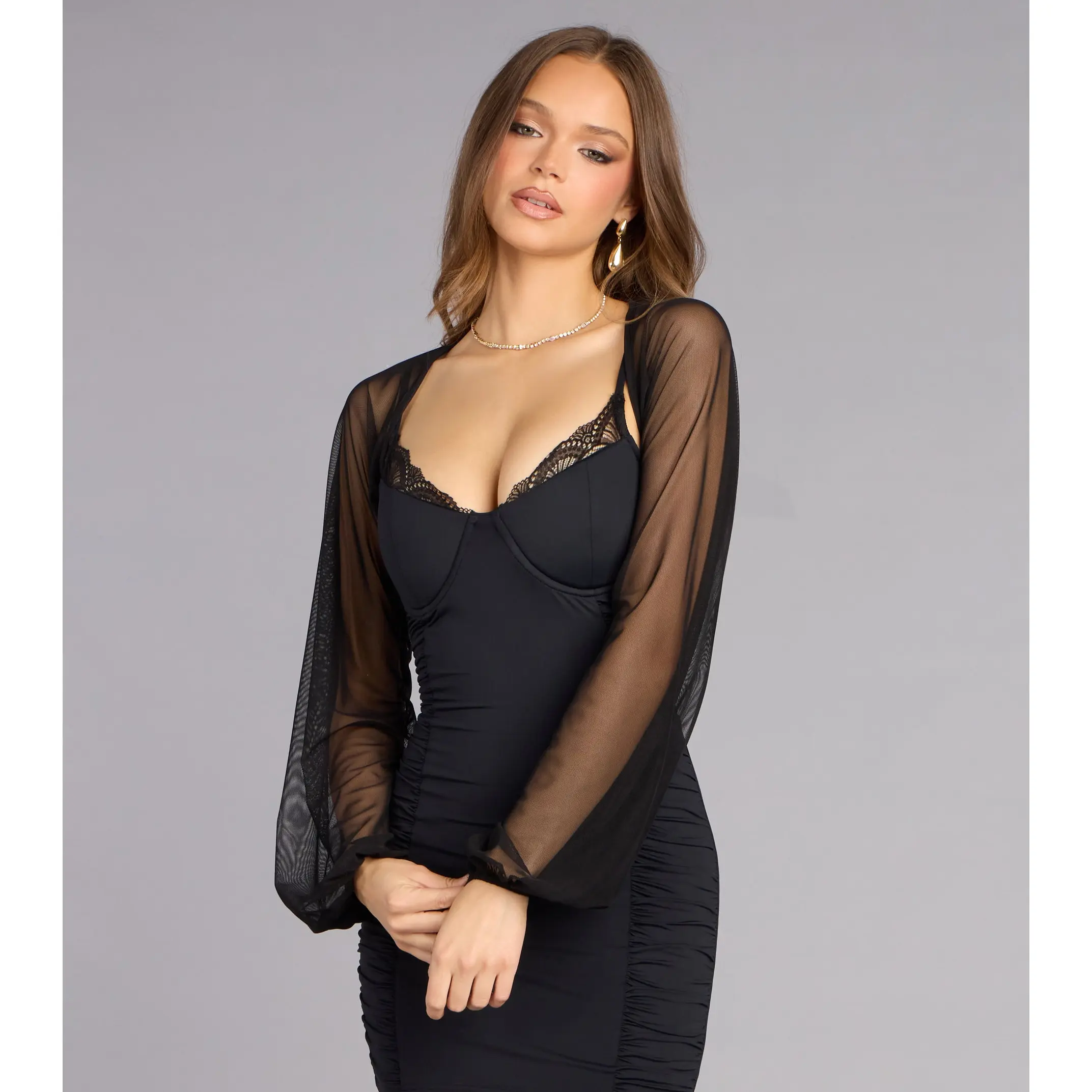 The mesh bolero that changes everything—subtle but makes it a look. This bolero adds a soft, sheer finish with airy sleeves that instantly elevate whatever you’re wearing under it.