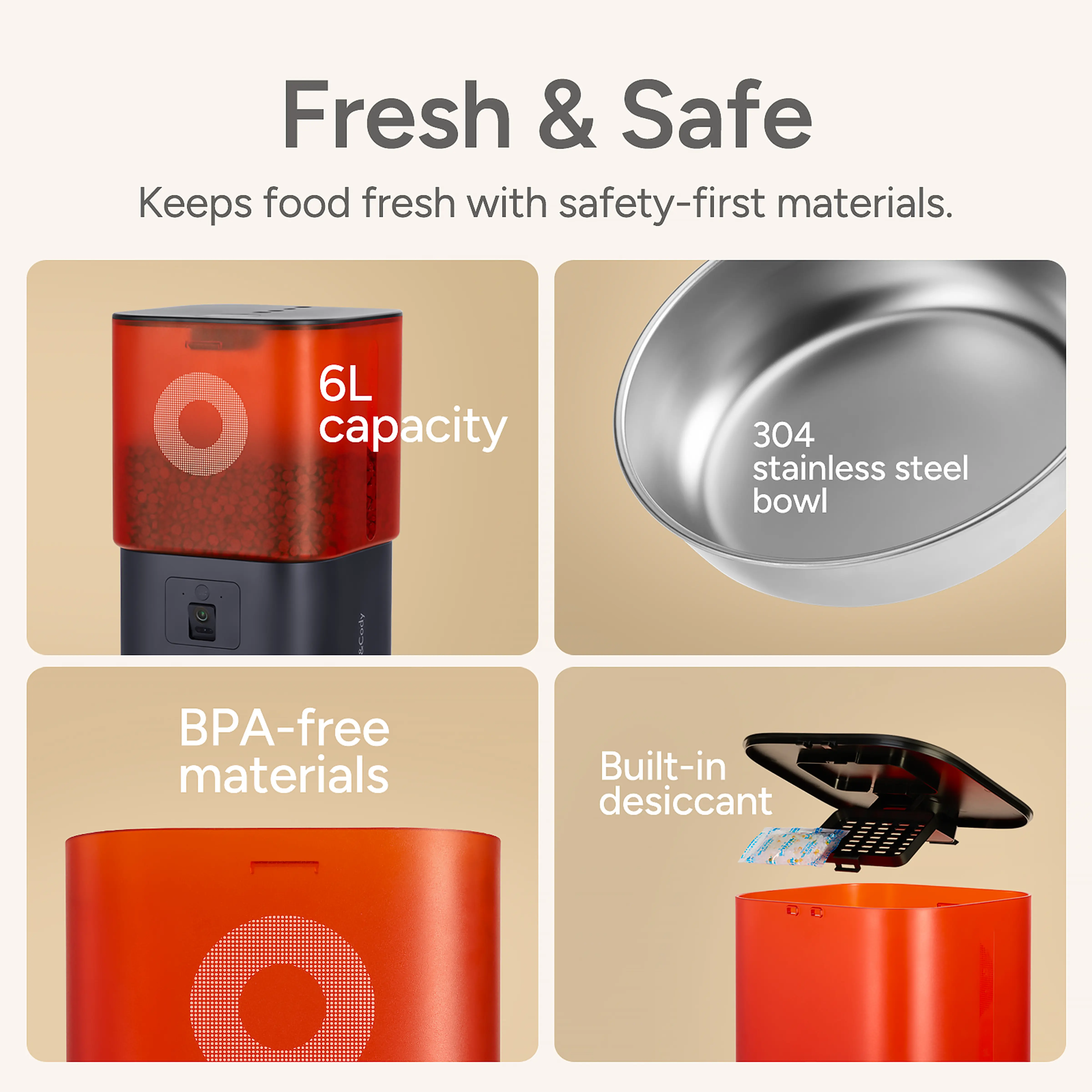 ·6L Large Capacity & Anti-Jam Design & Fresh Storage: The 6L food storage container holds enough food supports long-term feeding for pets, reducing the need for frequent refills, It’s the ideal solution for pet parents with busy schedules or long weekends away. The anti-jam structure ensures smooth and consistent food dispensing. Also, cat feeder automatic made with BPA-free materials, a 304 stainless steel bowl, and a built-in desiccant to keep food dry, fresh, and safe.