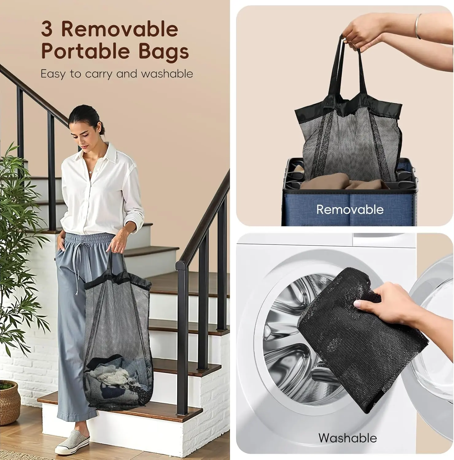 ·【3-Section Sorting & Removable Bags】With its 3 compartments, this laundry sorter allows you to pre-sort Lights/Darks/Colors, Kids/Adults/Bedding, Clothes/Towels/Underwear, Casual wear/Workwear/Delicates, , and remove bags directly for washing—eliminating messy transfers. Transform laundry chaos into an orderly and efficient routine