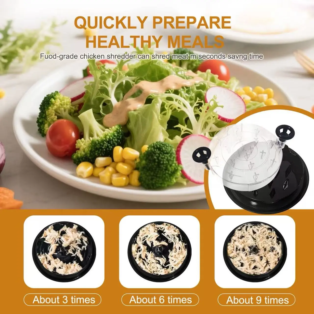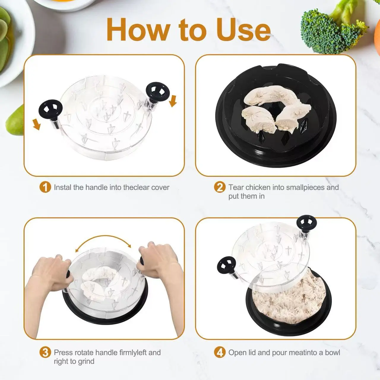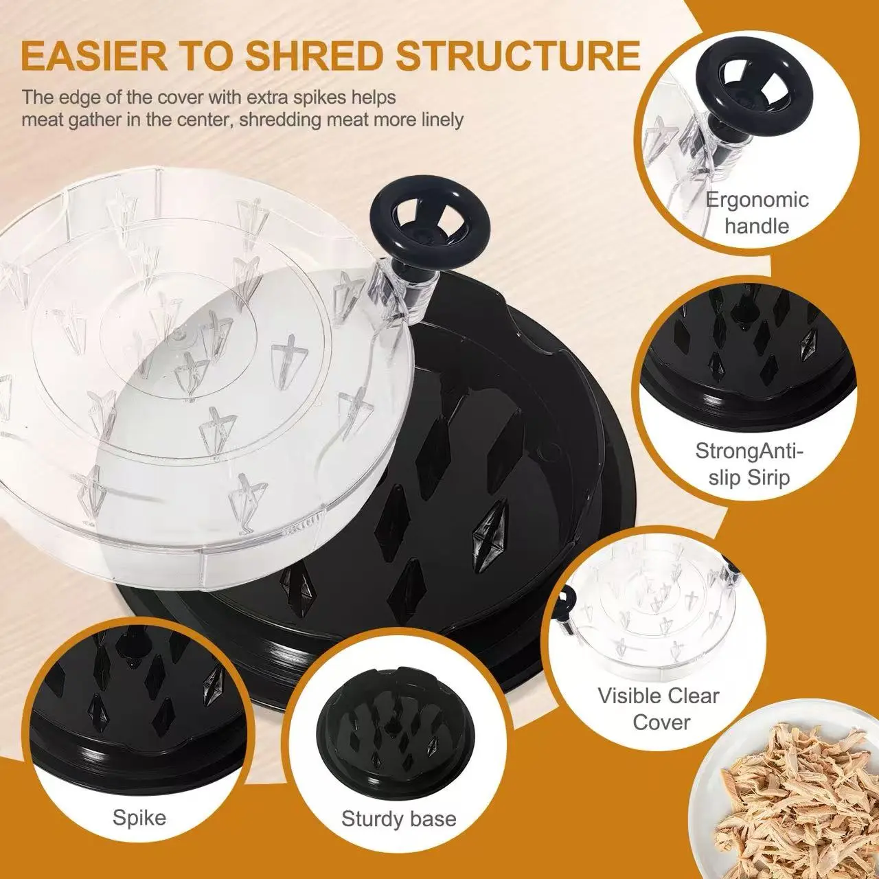 【HOW TO USE】: We need to cook meat first and cut it into small pieces, forbid using raw meat to shred it, as it will damage the spike. The small pieces can be divided into 3 parts to put on the shredder, which can shred the meat finely and evenly. If you need different shredding states, you can twist it many times to get it. When its state is finished through visible clear lid, you can open the cover and put the meat into the bowl to make your delicious food