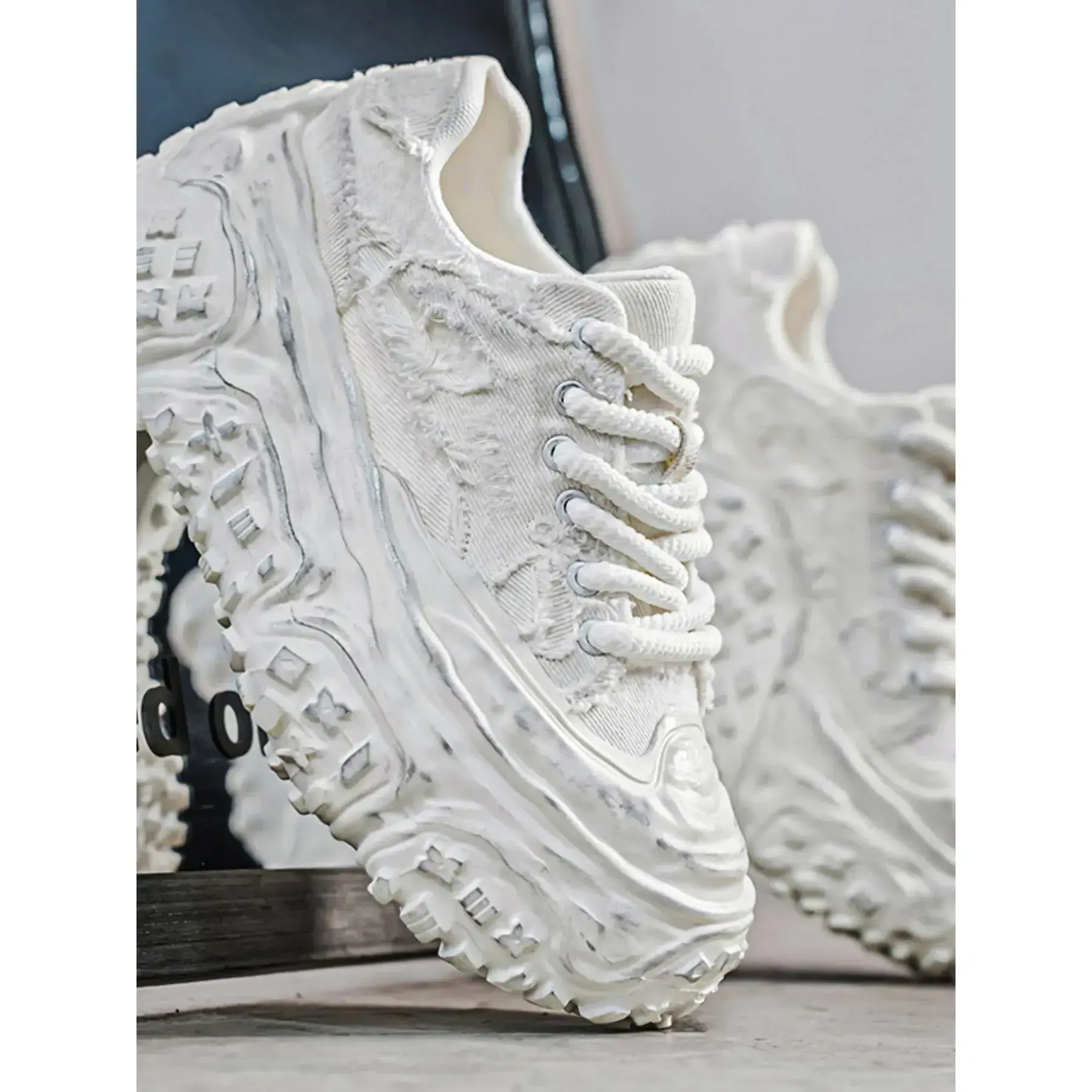 Elevate your streetwear game with these head-turning distressed denim chunky platform sneakerscrafted for the bold American fashion lover, sneakerhead, and avant-garde style enthusiast who wants to stand out from the crowd.