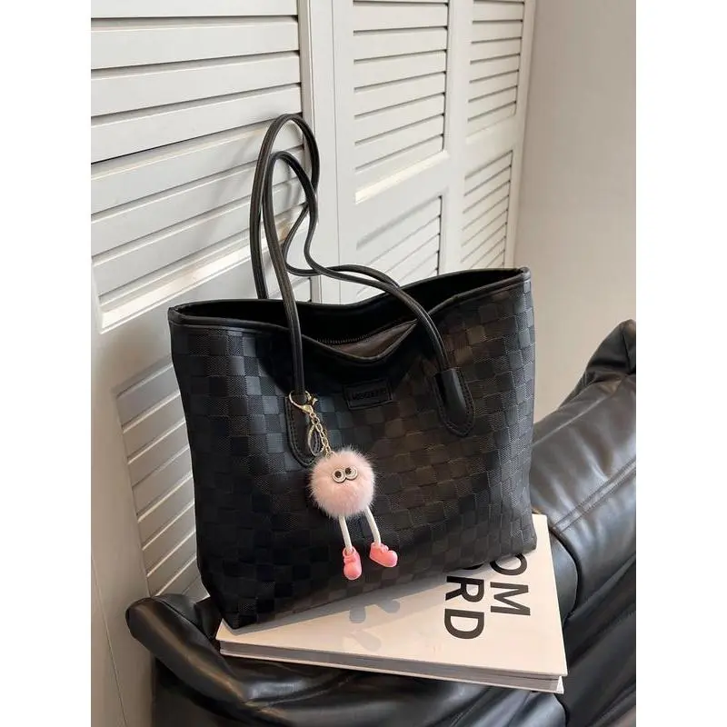 Timeless Checkered Style: Luxury embossed design that never goes out of fashion. All-Day Comfort: Padded shoulder straps make heavy loads feel light. Secure & Organized: Zipper closure keeps your belongings safe and easy to access. Two Versatile Colors: Pick black for a professional look or beige for a soft, feminine vibe. Cute Charm Included: Playful pom pom keychain adds a fun, trendy touch to your bag.
