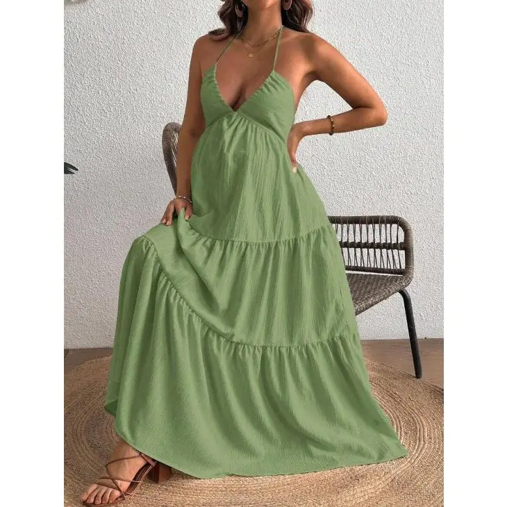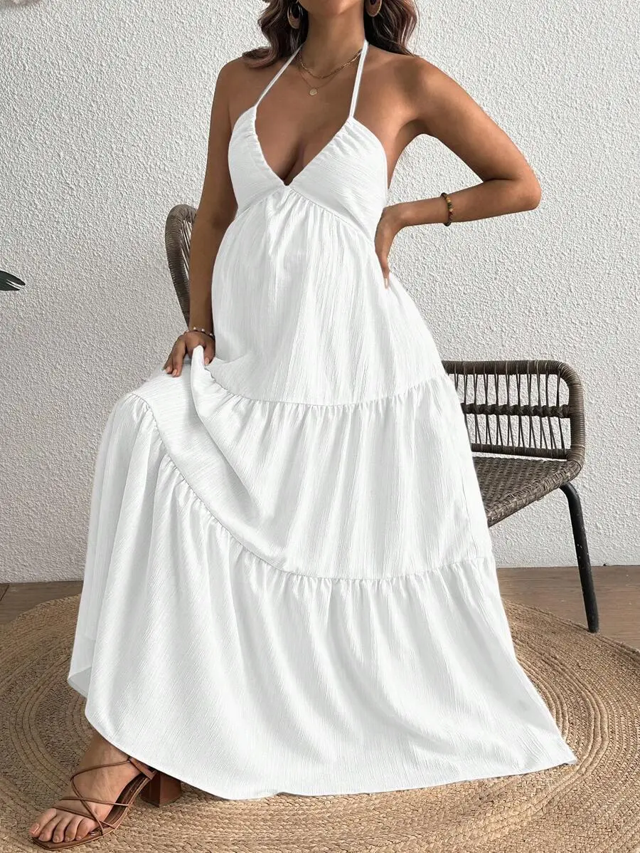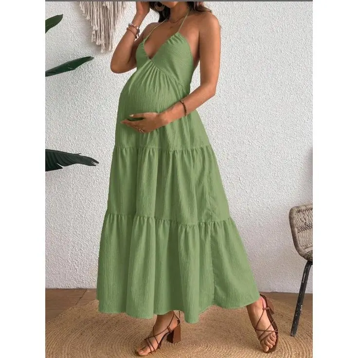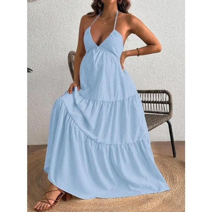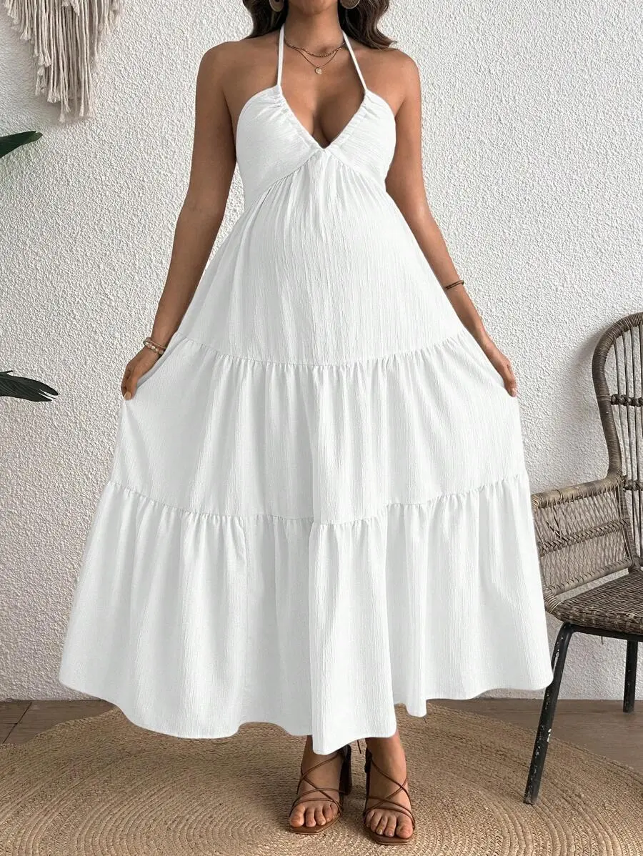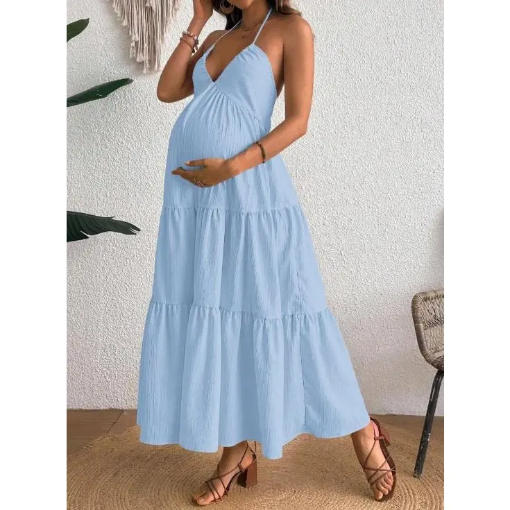 ELLIOTTWII Maternity Comfortable Halter Backless Ruffle Hem Sleeveless Dress