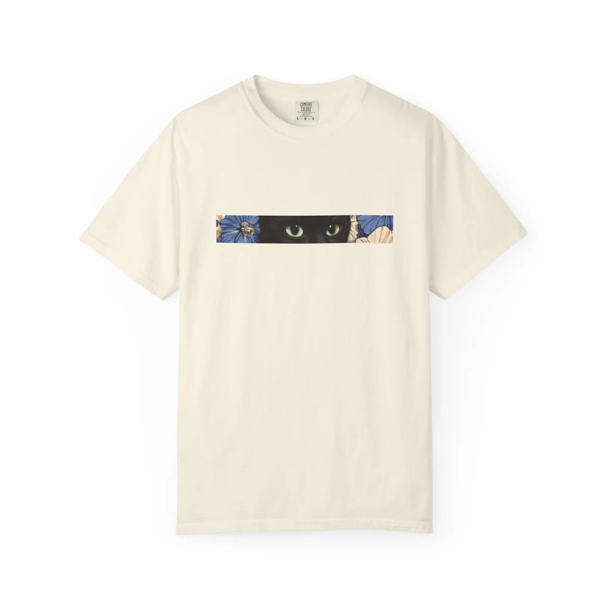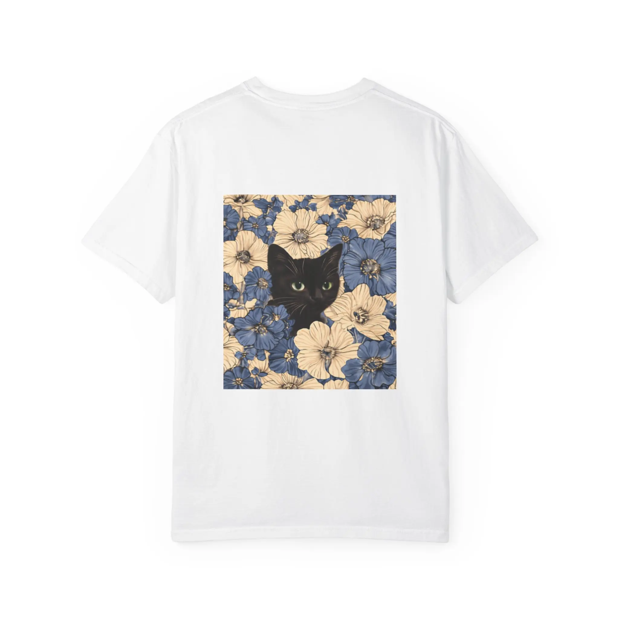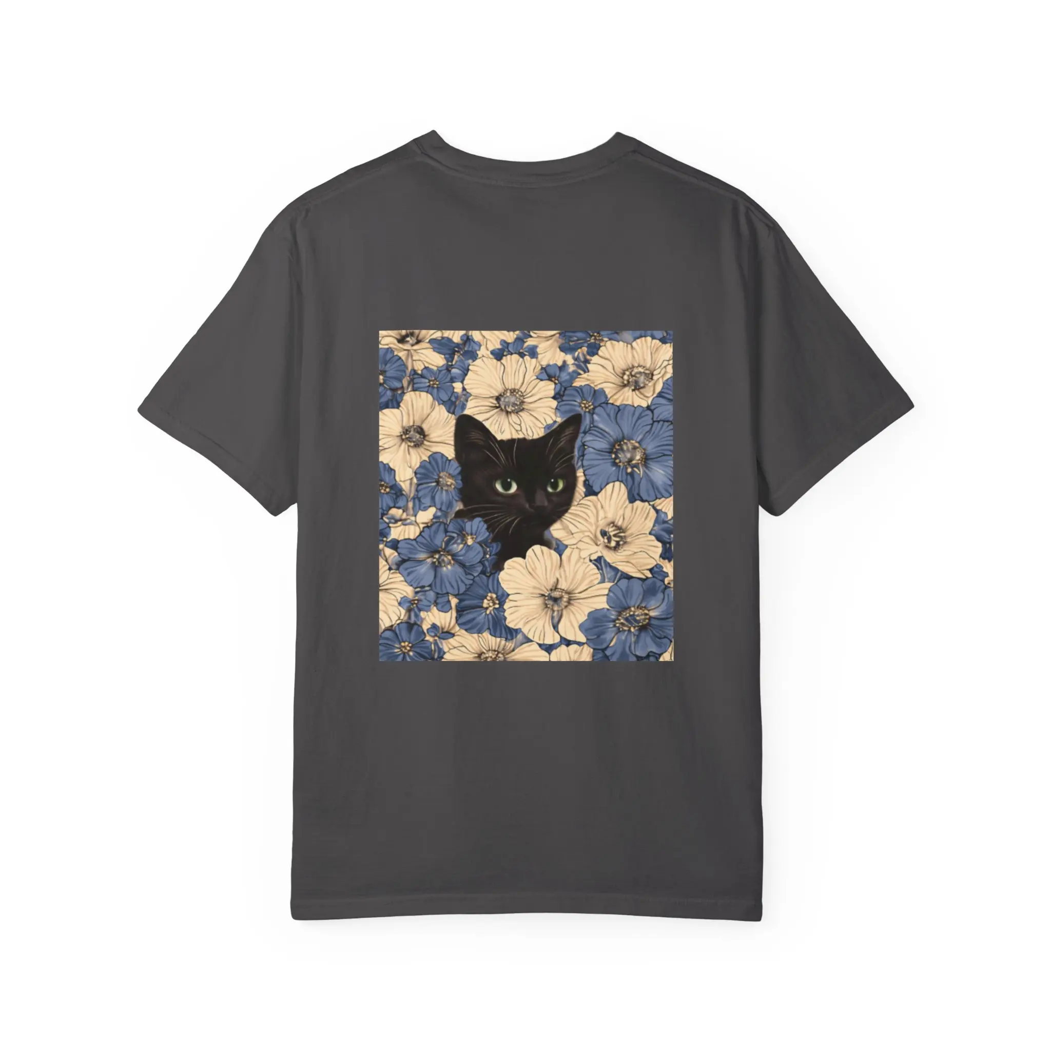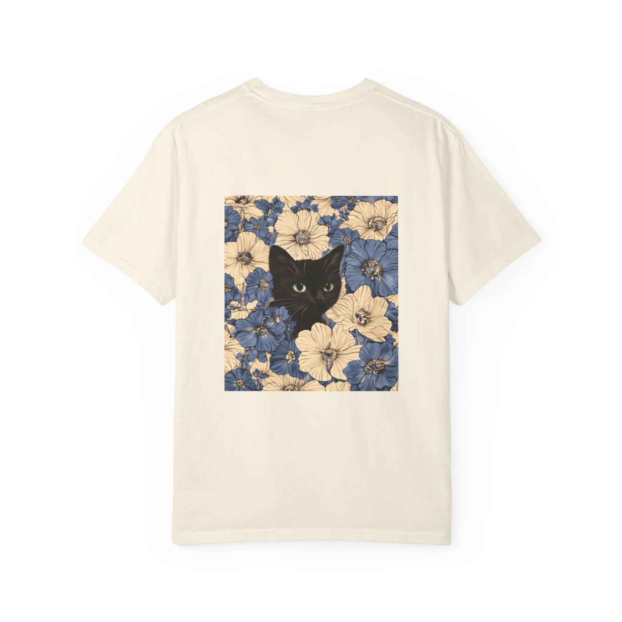 This relaxed-fit garment-dyed tee brings quiet charm to everyday wear. A soft, vintage-colored fabric carries a detailed illustration of a curious black cat peeking from a field of blue and cream blossoms. The shirt feels lived-in from day one thanks to garment-dyeing and heavyweight ring-spun cotton, so it sits comfortably through errands, coffee shop breaks, and slow weekend mornings. Wear it as an easy layering piece or let the back art be the focal point on a sunlit walk or a casual meet-up with fellow cat lovers.