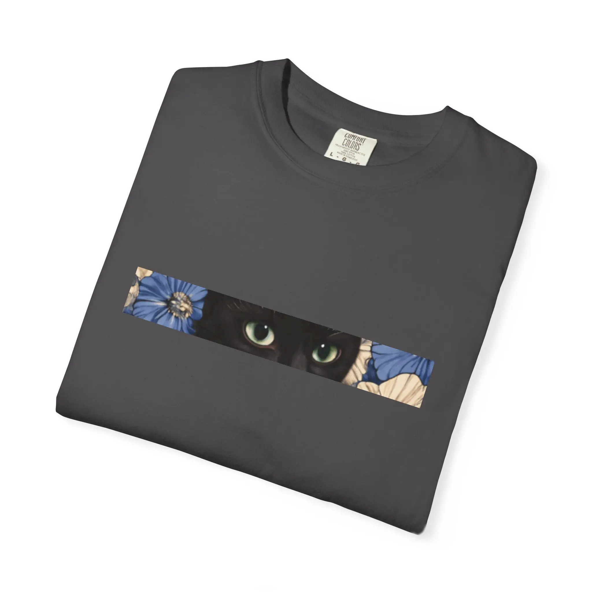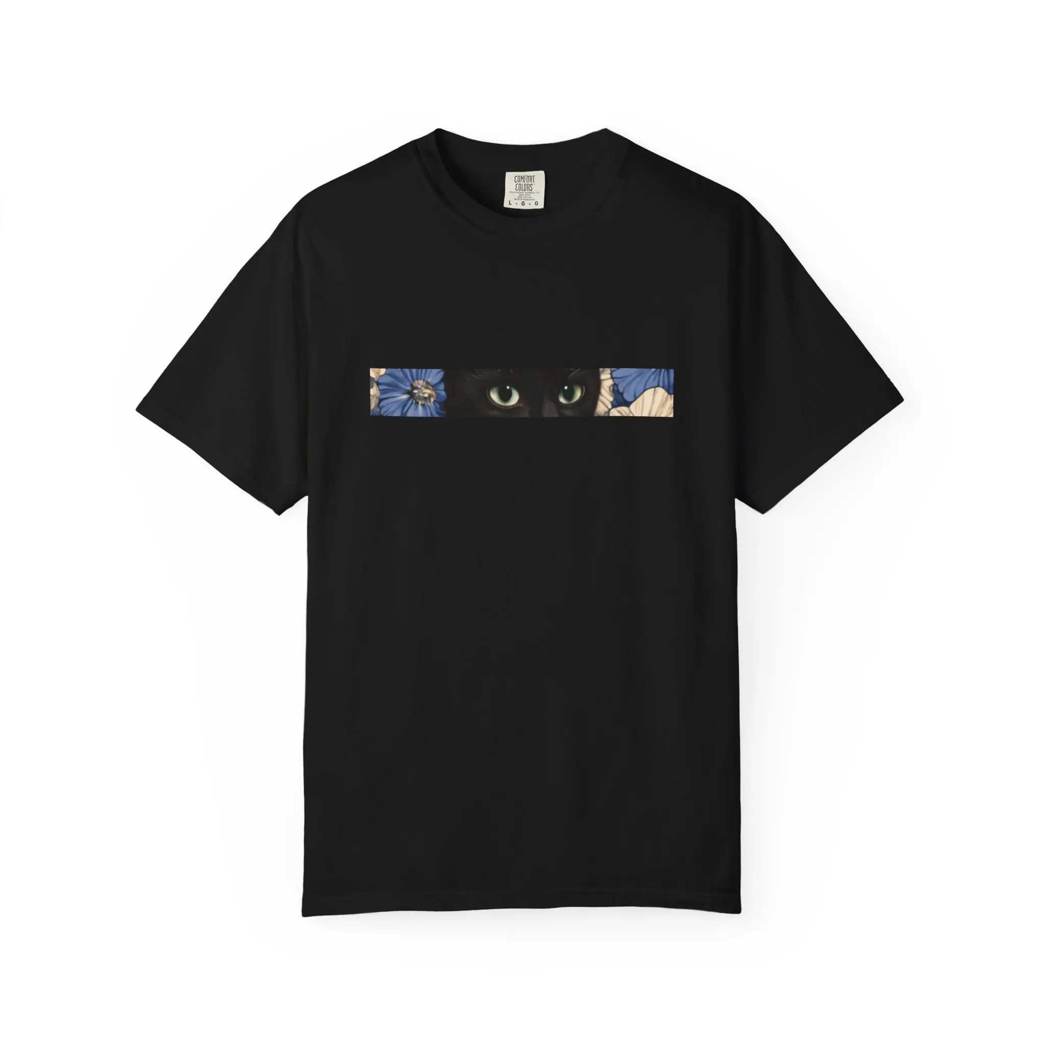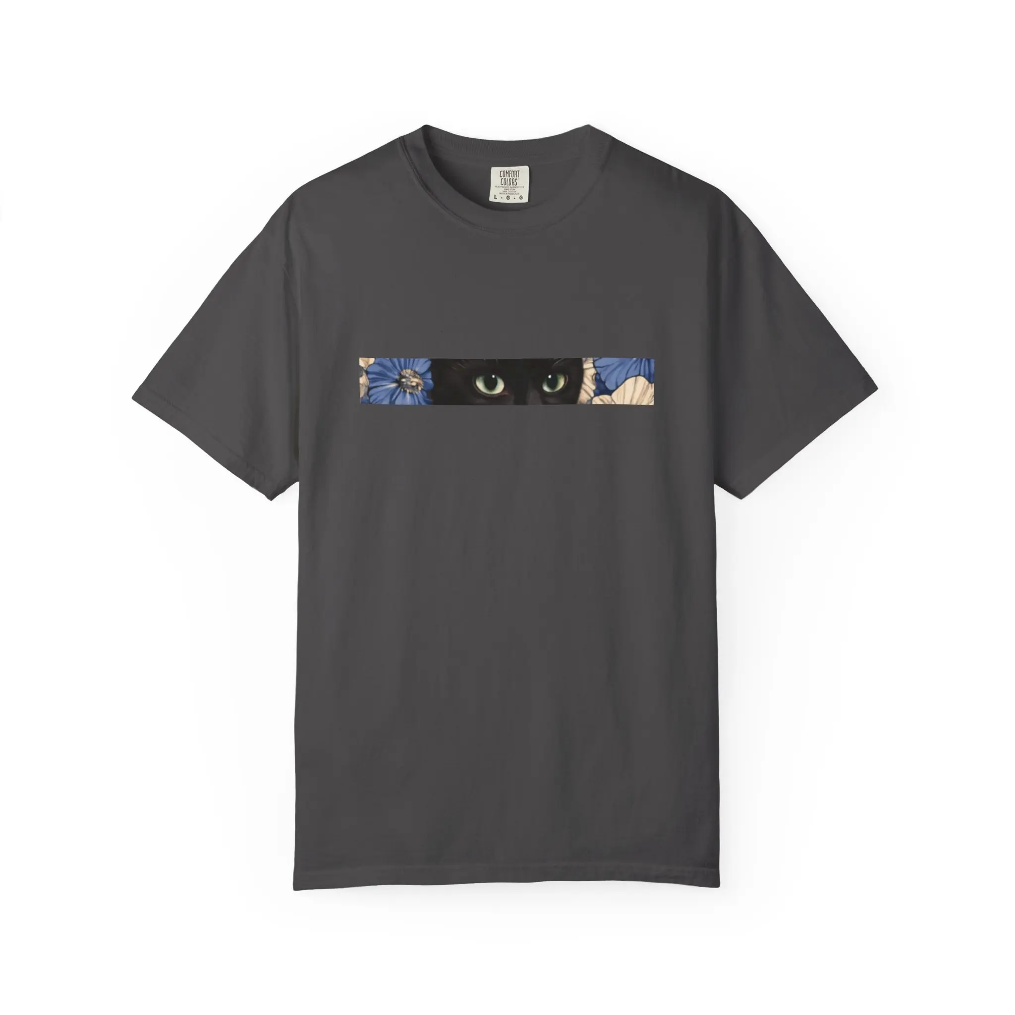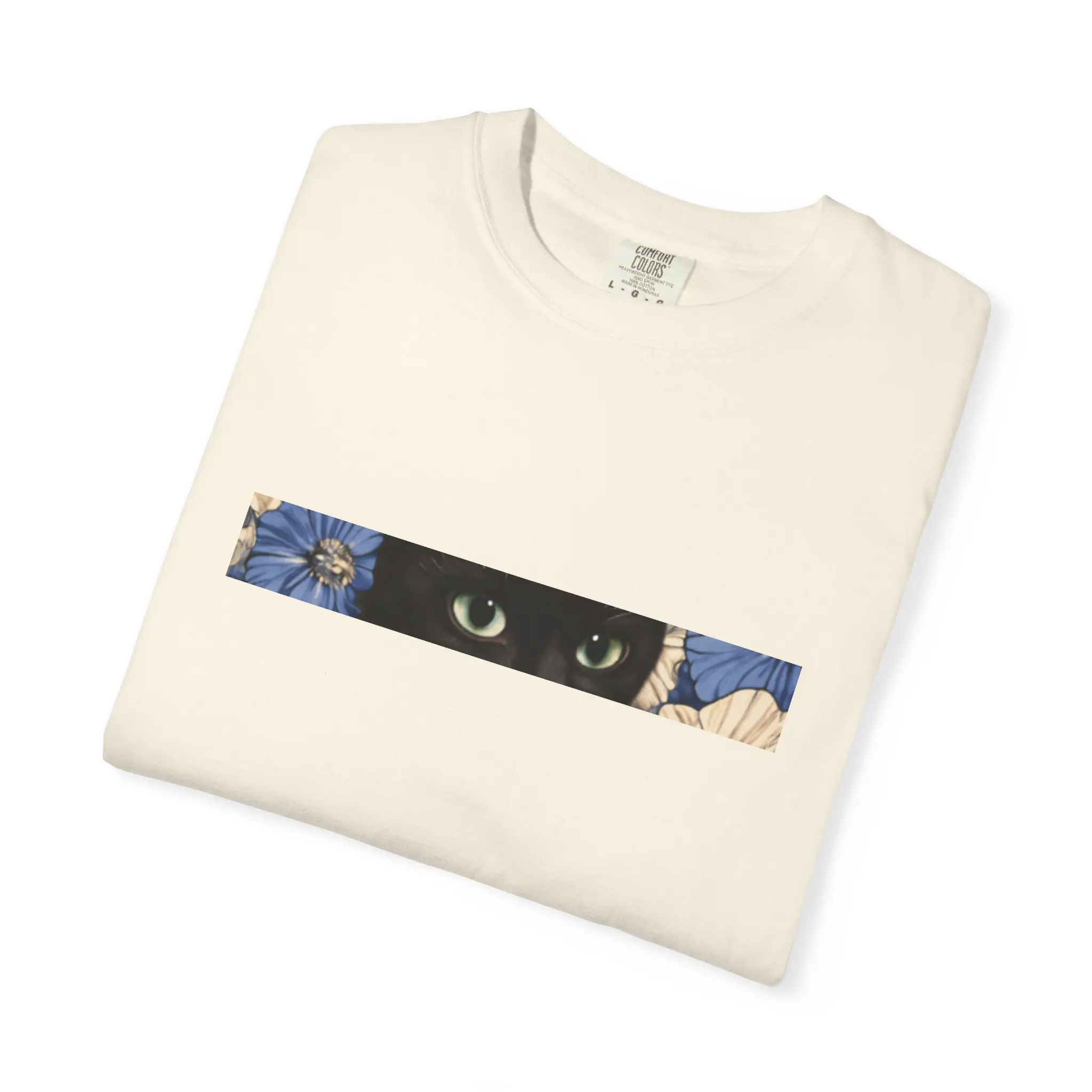 This relaxed-fit garment-dyed tee brings quiet charm to everyday wear. A soft, vintage-colored fabric carries a detailed illustration of a curious black cat peeking from a field of blue and cream blossoms. The shirt feels lived-in from day one thanks to garment-dyeing and heavyweight ring-spun cotton, so it sits comfortably through errands, coffee shop breaks, and slow weekend mornings. Wear it as an easy layering piece or let the back art be the focal point on a sunlit walk or a casual meet-up with fellow cat lovers.