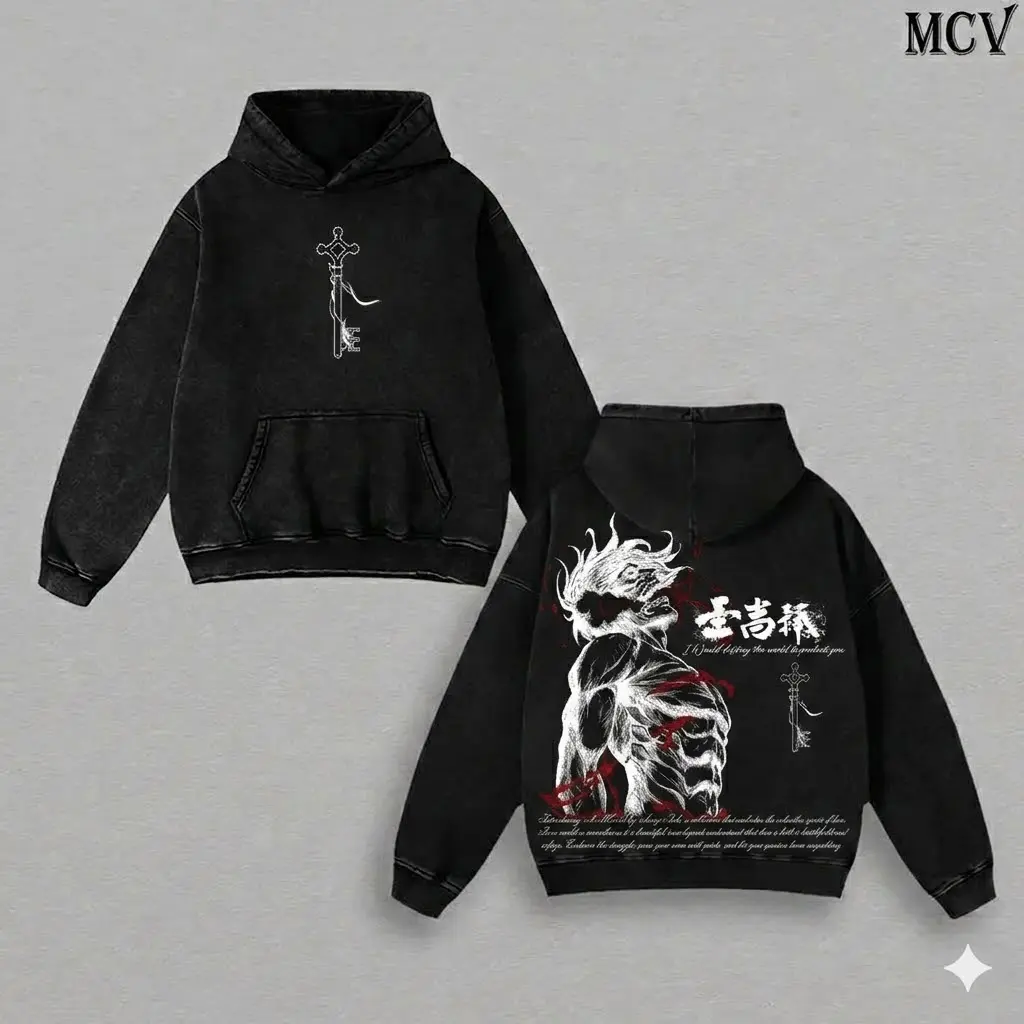Titan Warrior Inspired Vintage Washed Hoodie, Oversized Anime Street Style Pullover
