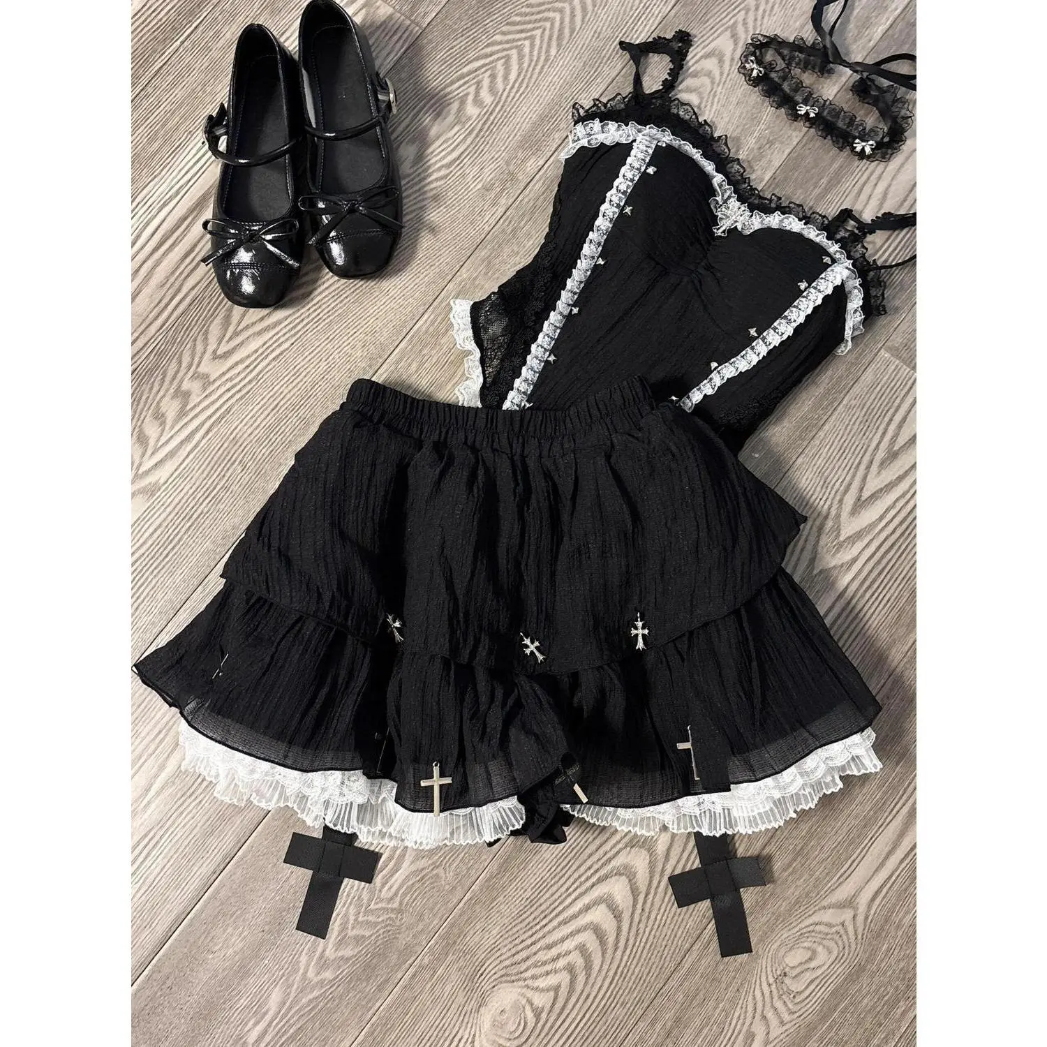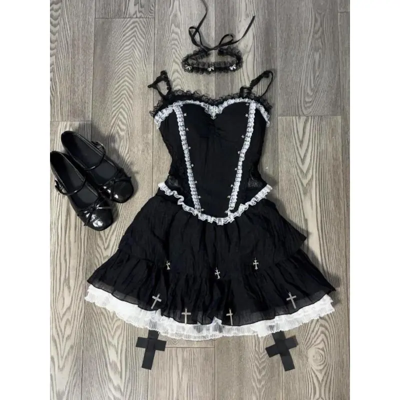 Black Gothic Lolita Suits Halloween 2 Piece Set Women Lace Top + Blakc Cake Mini Skirt + Sleeve Cosplay Vintage Clothing
