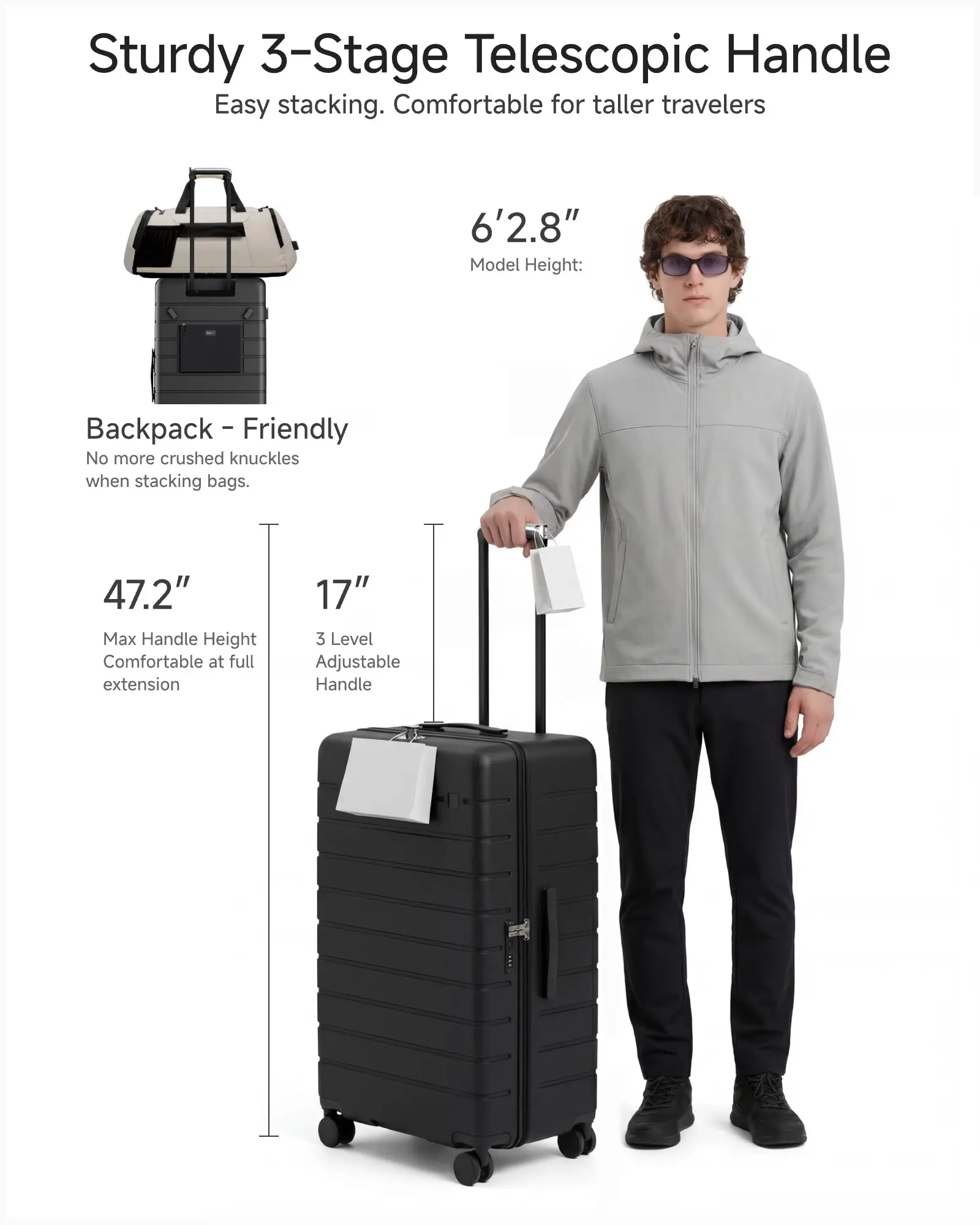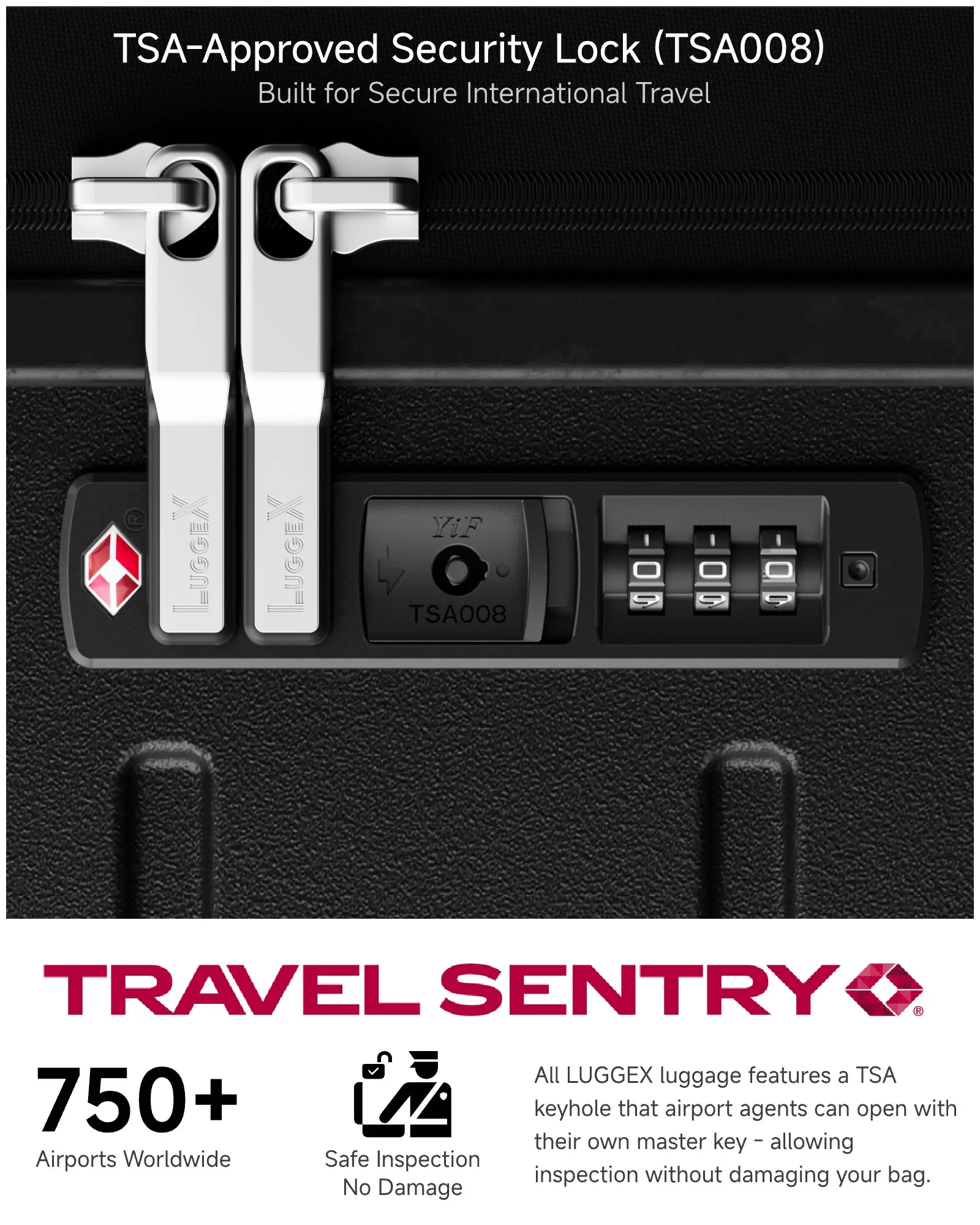 ·Smart Travel Design with TSA Lock & Hook: Built with a TSA(008)-approved lock for secure and hassle-free inspections, this luggage features a built-in hook and integrated rack handle for carrying extra bags hands-free, making travel more convenient and efficient.