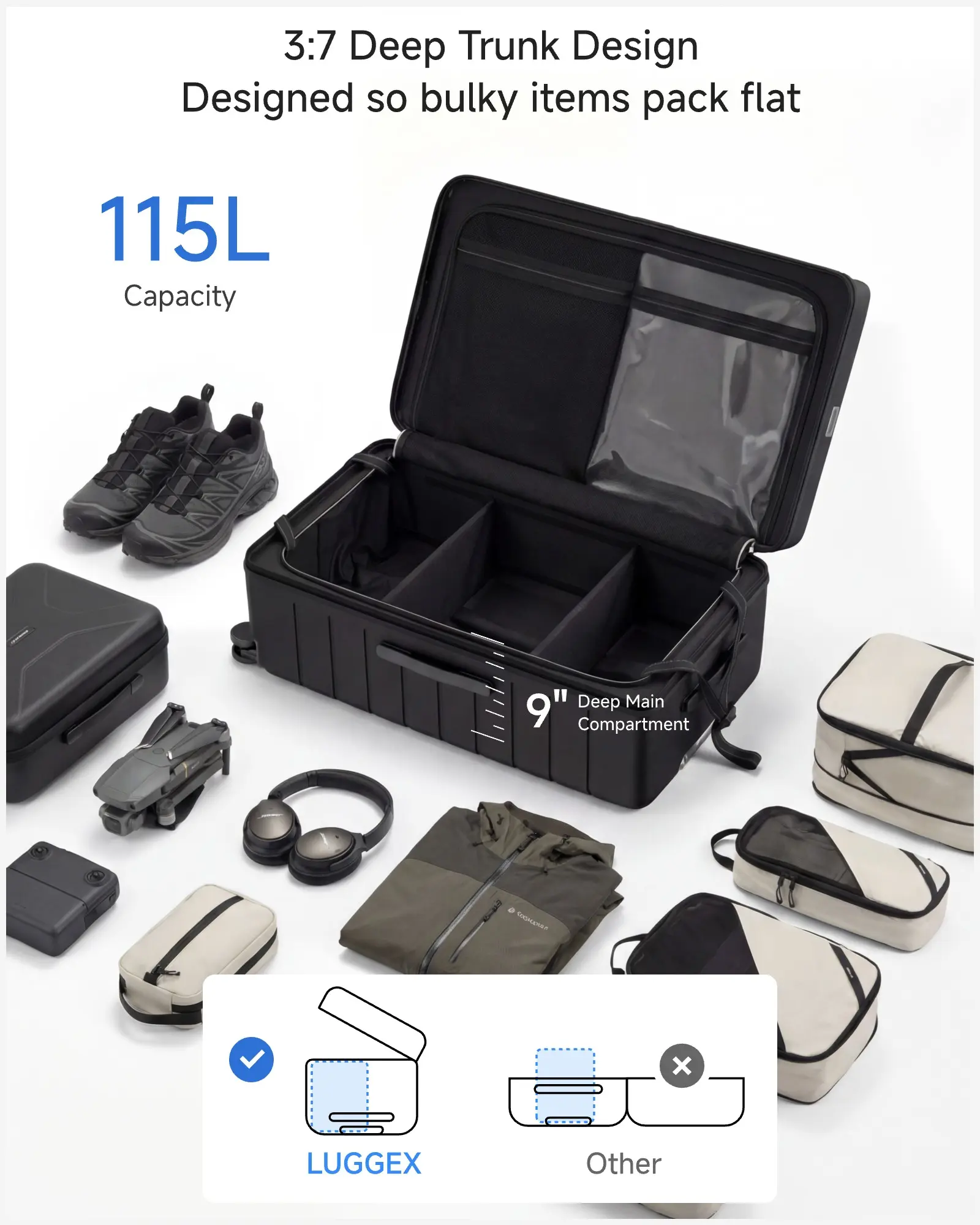 ·Trunk Design for Deep Packing: This trunk luggage features a 3:7 split structure with a deeper compartment, ideal for bulky items like coats and boots. A rear handy pouch keeps essentials within easy reach, while the flat interior layout keeps packing more organized than a standard 30 inch suitcase.