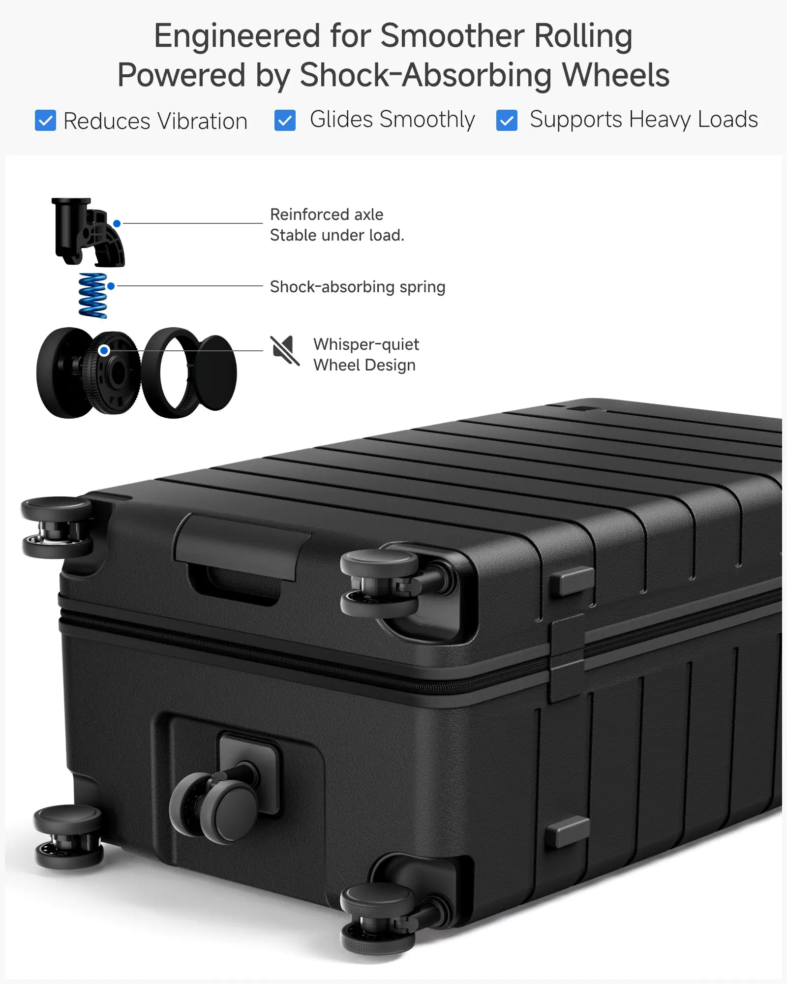·Shock-Absorbing 5-Wheel System for Smooth Travel: Built with an upgraded 5-wheel system and spring suspension, this 30 inch luggage with spinner wheels absorbs shocks and reduces vibration for smoother, more stable rolling. Glide effortlessly across airports, streets, and uneven surfaces, even when fully packed.