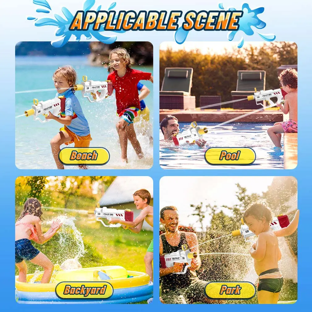 Dominate water battles with this high-performance electric water gun!Equipped with a rapid-fire pneumatic system, it unleashes powerful streams up to 275-315 inches (23-26 feet).The 300ml detachable tank ensures extended playtime.Dynamic LED muzzle flashes amplify the thrill of every shot.