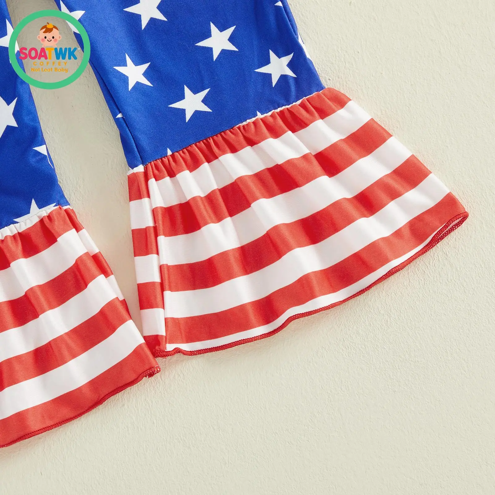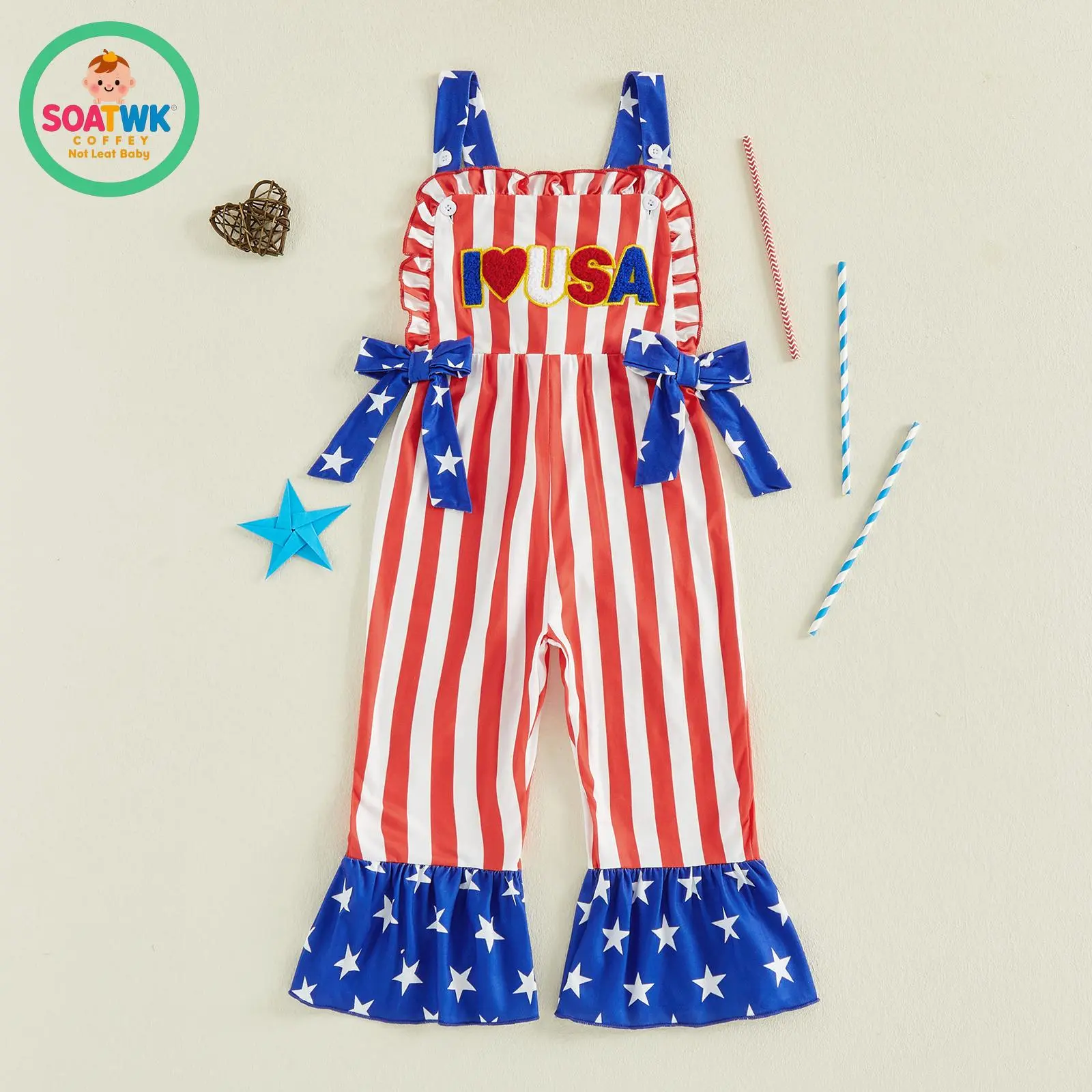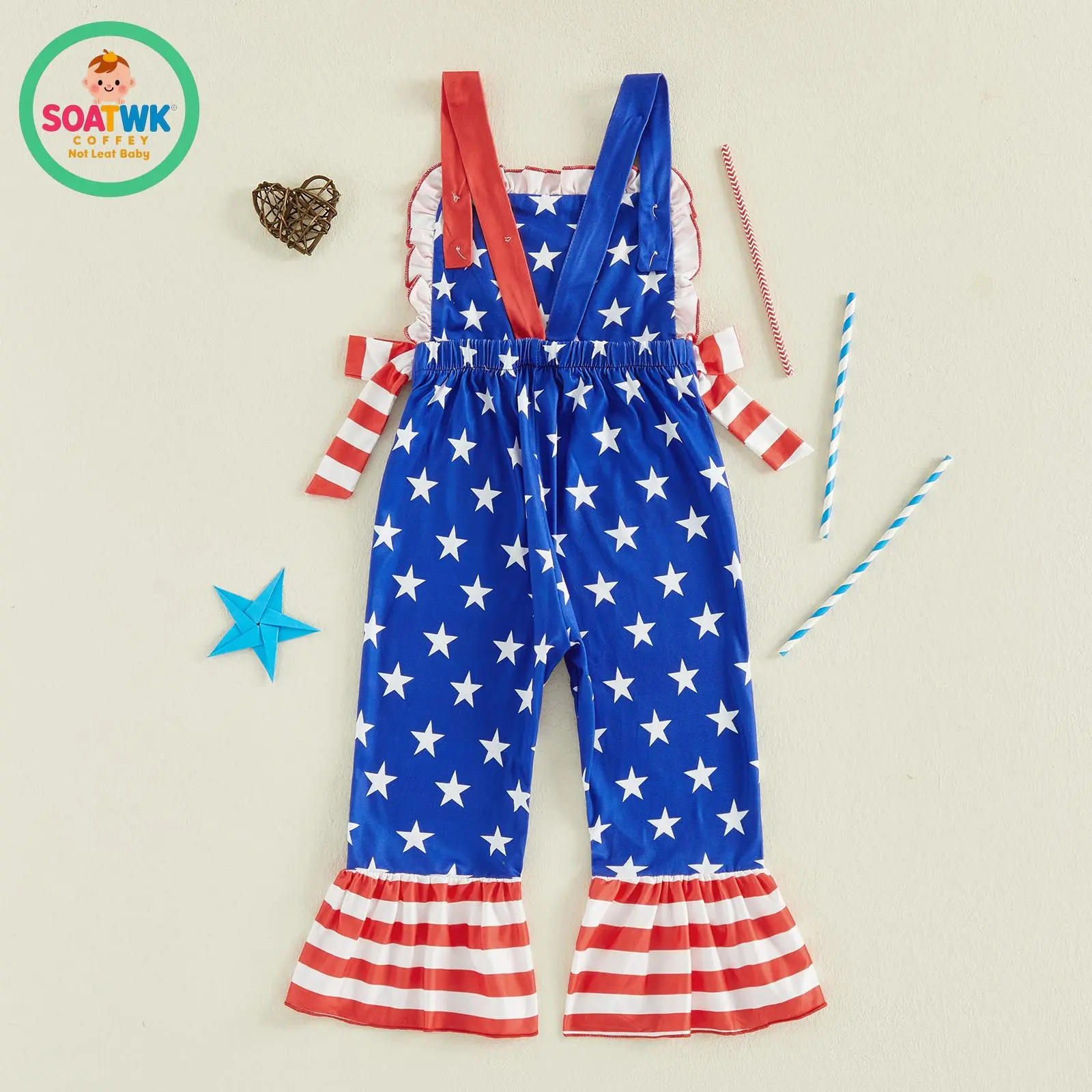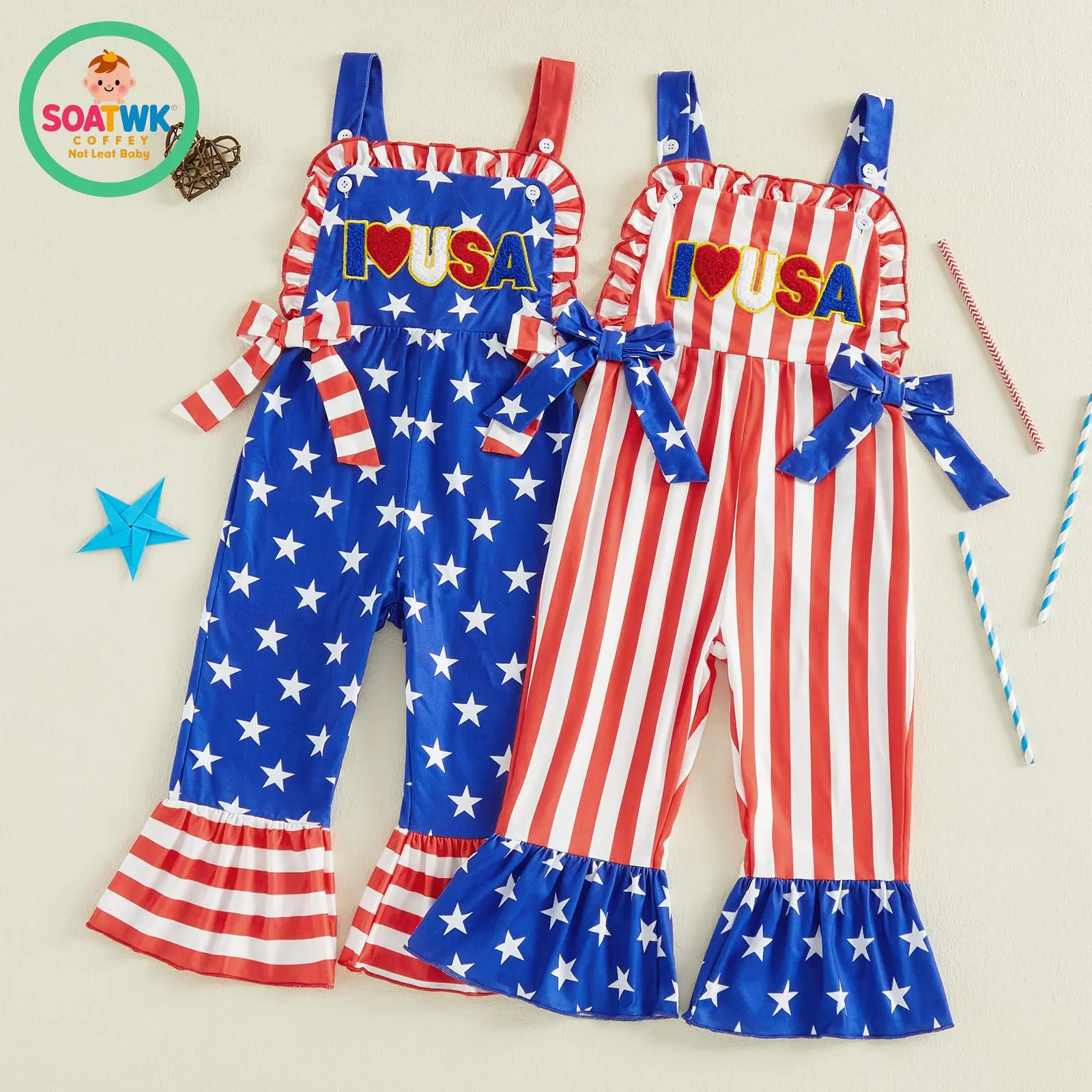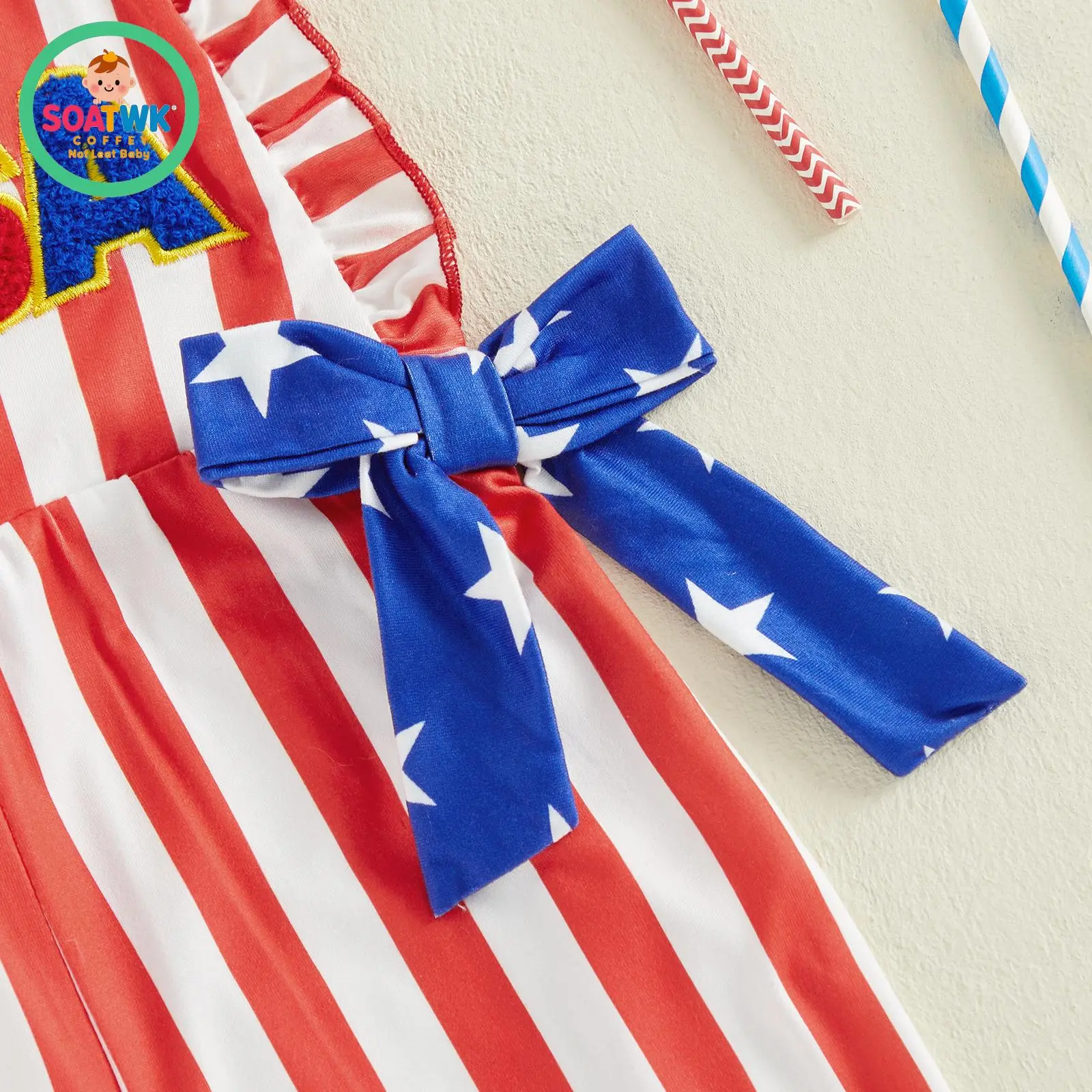 Baby Girl Fourth of July Romper Sleeveless Stars and Stripes Print Bow Jumpsuit Toddler Overalls