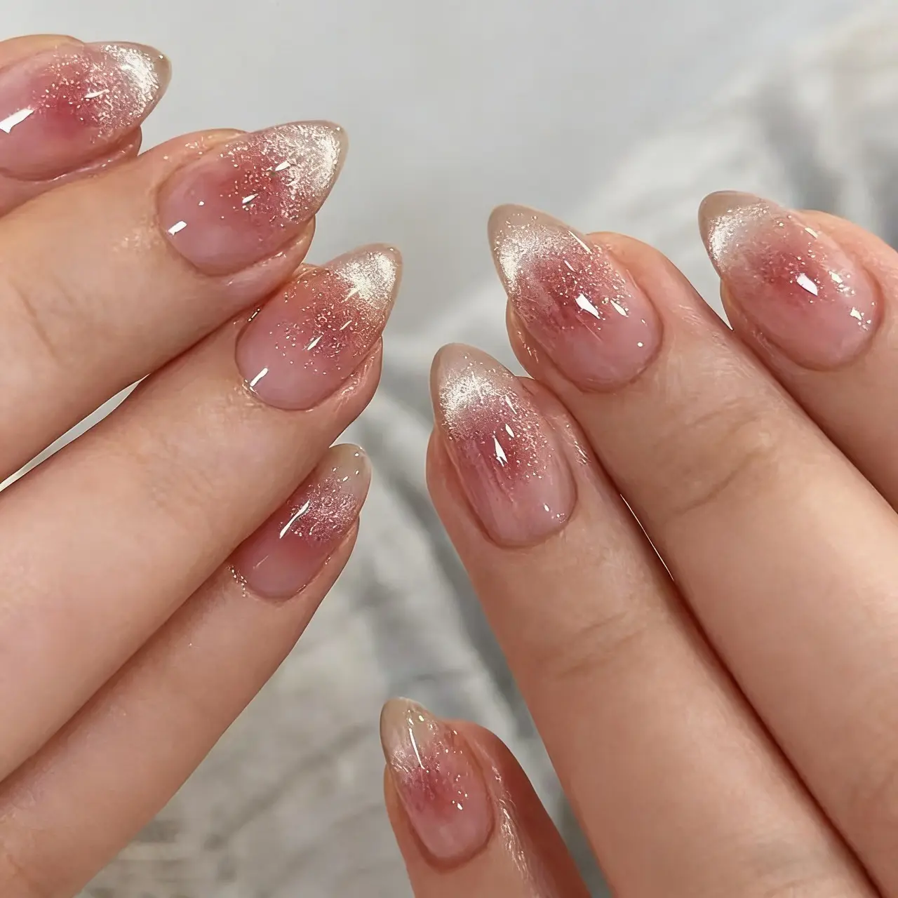 Subtle sophistication for the modern woman!These short almond-shaped nails feature a stunning cat-eye magnetic gradient in pink nude tones.Perfect for daily wear with just the right amount of sparkle.
