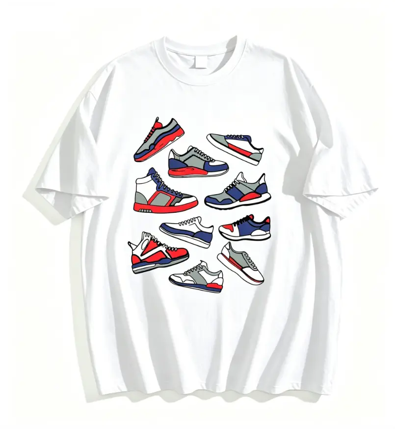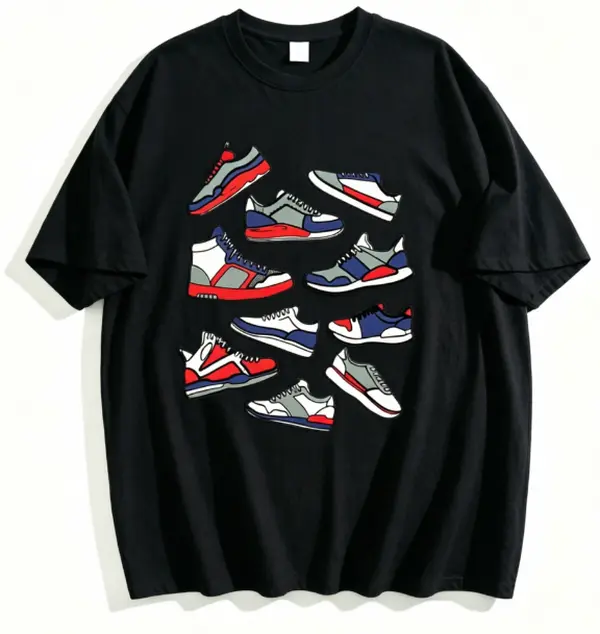 This T-shirt is a must-have for sneaker enthusiasts. It features a fun cartoon sneakers graphic that appeals to shoe lovers. The design is eye-catching and adds a playful touch to your wardrobe. Ideal for those who appreciate unique and stylish apparel.