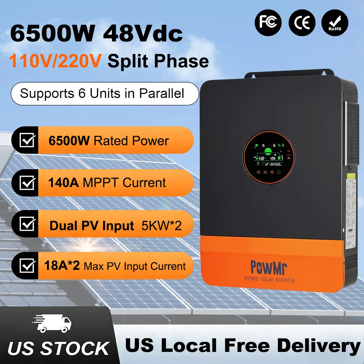 ·【Split-phase Parallel Solar Inverter】This split-phase inverter supports split-phase and single-phase pure sine wave output. One 6500w inverter can also output 120V and 240V simultaneously through different connections. You can upgrade your setup with parallel operation capabilities, expanding up to 39kW with up to 6 units.