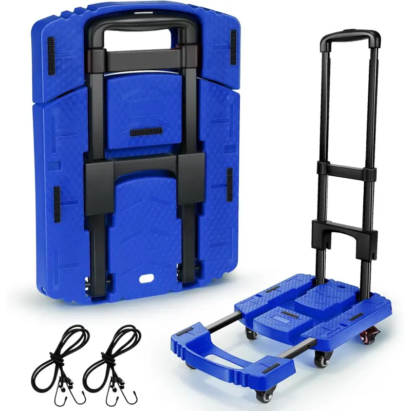 **Adjustable Platform + 2 Elastic Ropes**: The dolly cart has an adjustable platform that can fit items of various sizes and comes with two elastic ropes for securing items during transport, adding flexibility and convenience