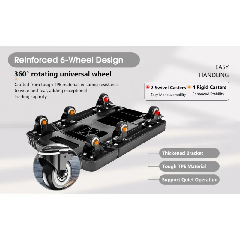 **Enhanced 6 Wheels Design**: Crafted from tough TPE material, ensuring resistance to wear and tear.Including 2 fixed front wheels + 4 swivel wheels, which are securely fastened with thick brackets and screws, providing exceptional stability