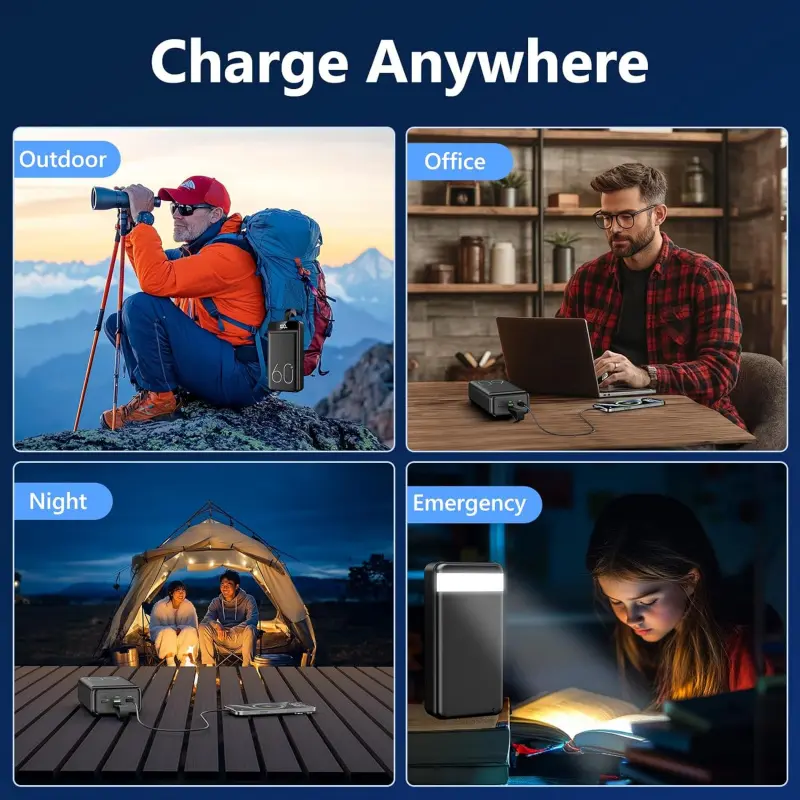 [Colossal Cell Capacity]The 60000mAh power bank provides 12 charges for iPhone11, 12 times for S10.Depending on battery size, smartphones will get over 12 full charges.This large power bank suitable for travel, camping, hiking, vocation and other ourdoor activities