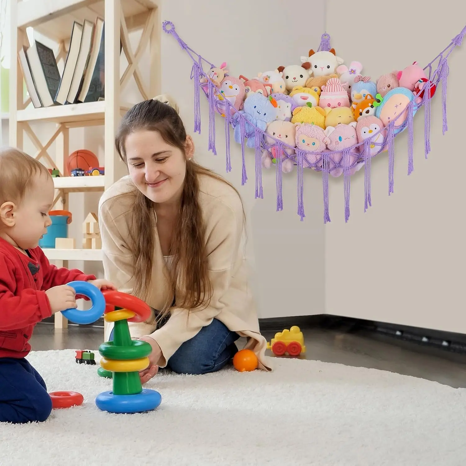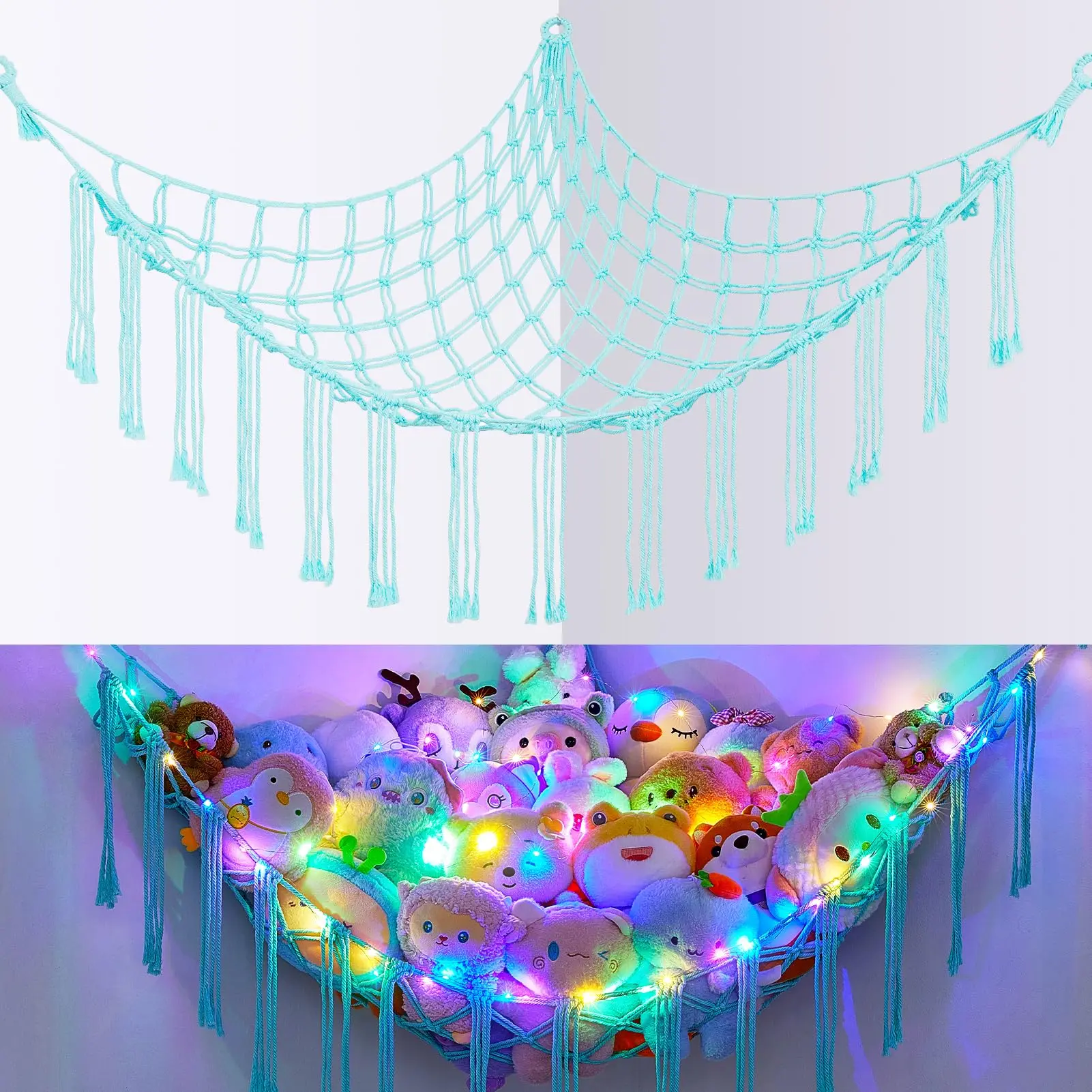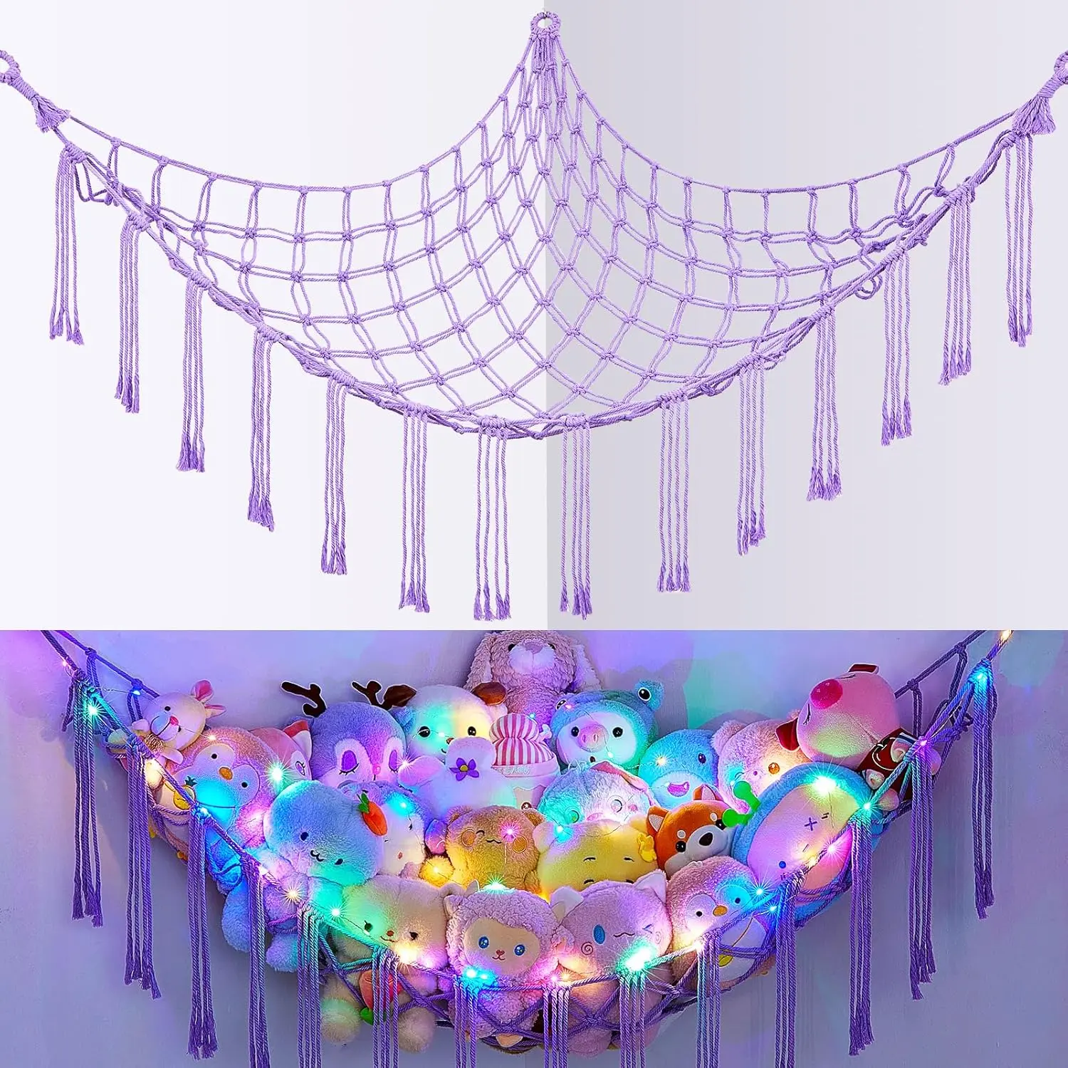 Stuffed Animals Net or Hammock with LED Light, Hanging Stuffed Animals Storage Toy Hammock Net Corner Wall Girls Room Decor Toy Storage Organizer, Purple,